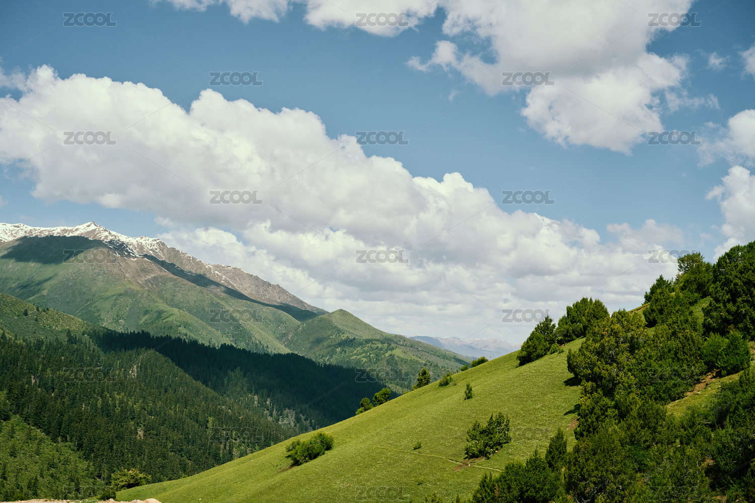 四川川西云杉森林、蓝天白云、雪山景色