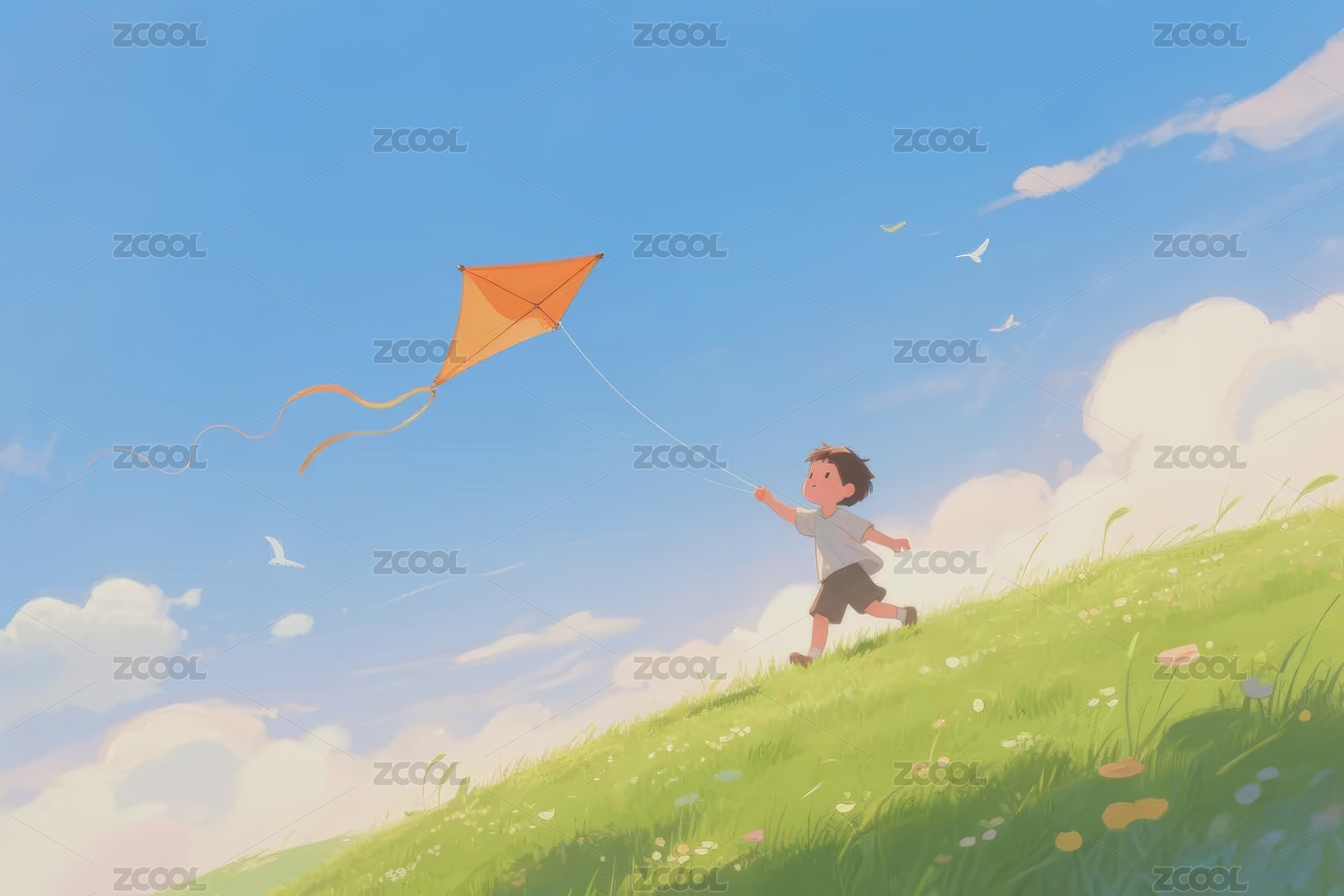扁平,插画,儿童,女孩,女童,放风筝,风筝,奔跑,跑,白天
