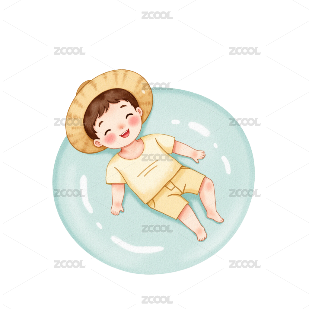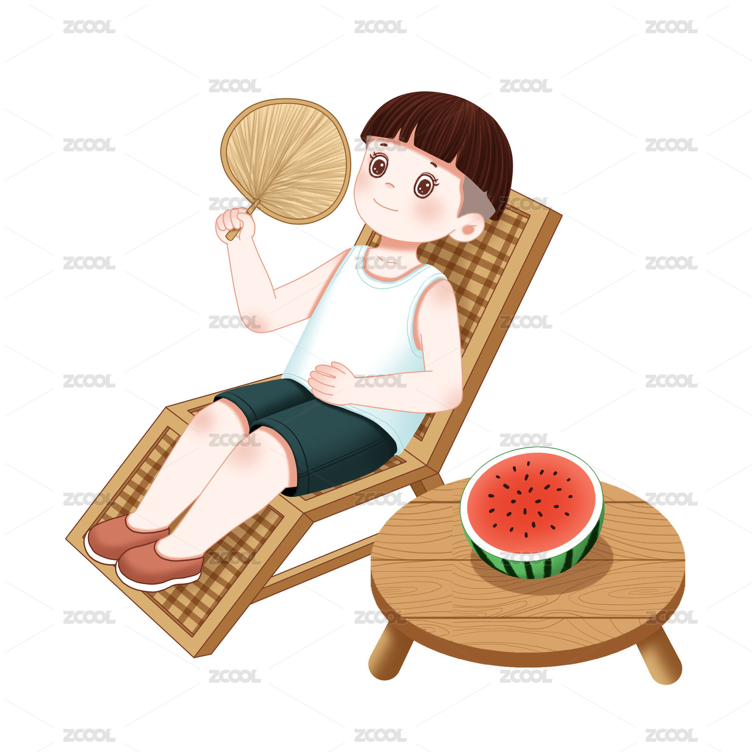 夏天躺椅上扇扇子纳凉吃西瓜的小孩