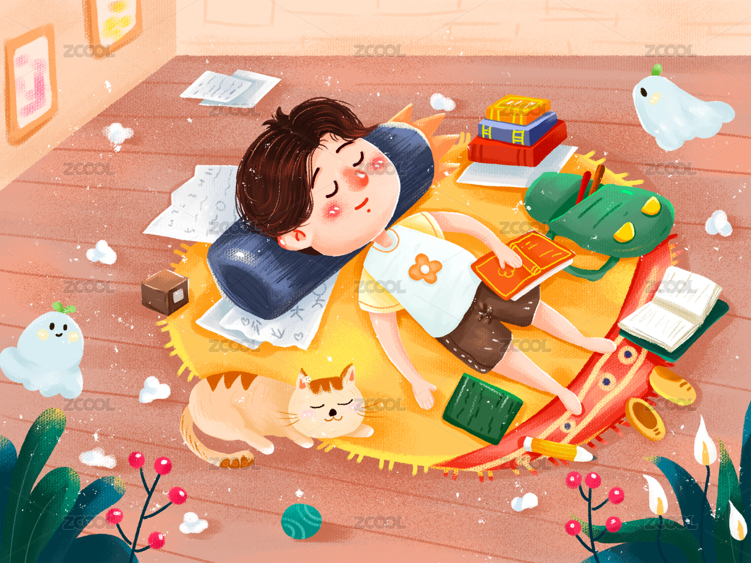 暑假,宅,假期,插画,学生放假,宠物,陪伴,家庭,室内,轻质感