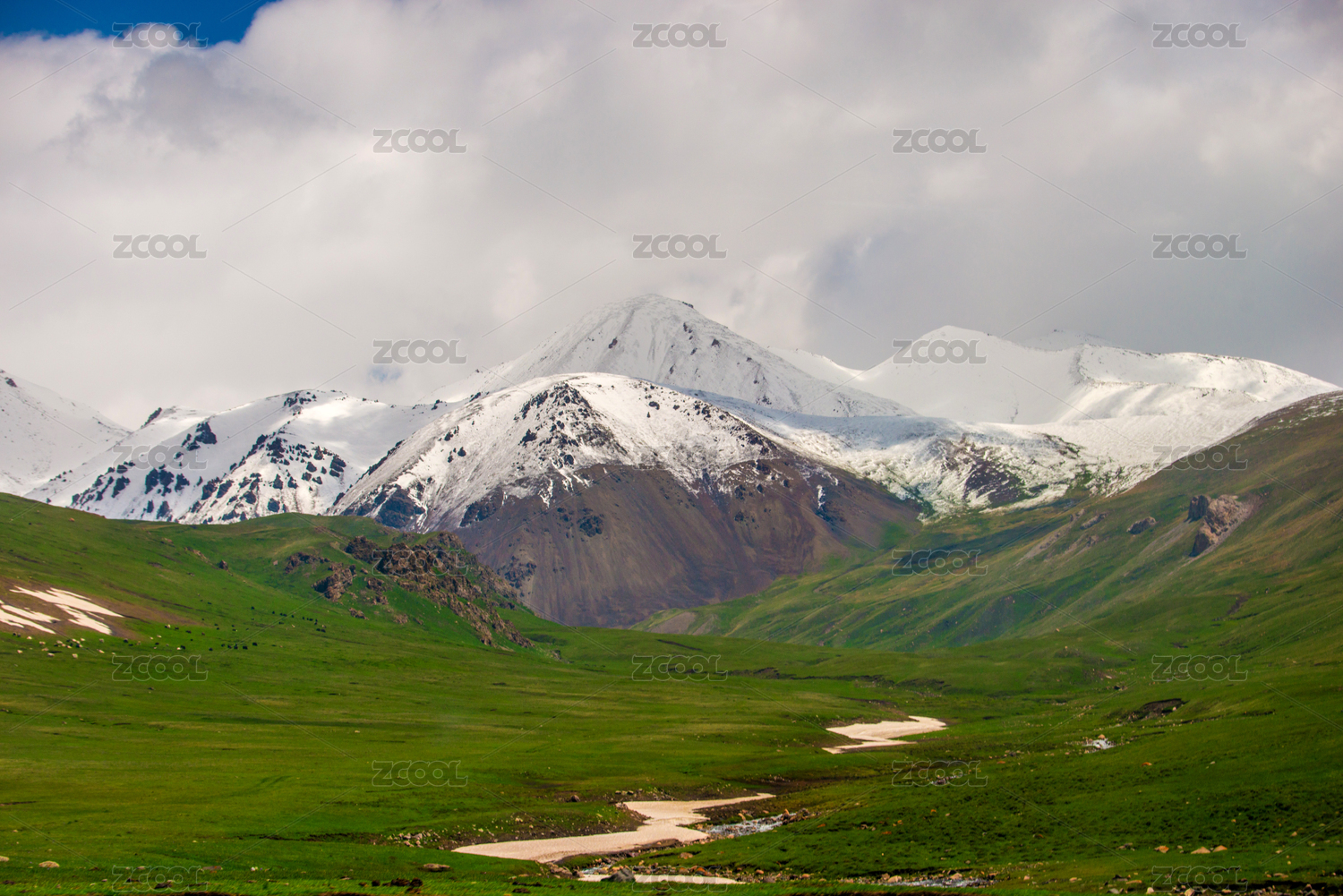 中国新疆山脉冰川和绿色草原