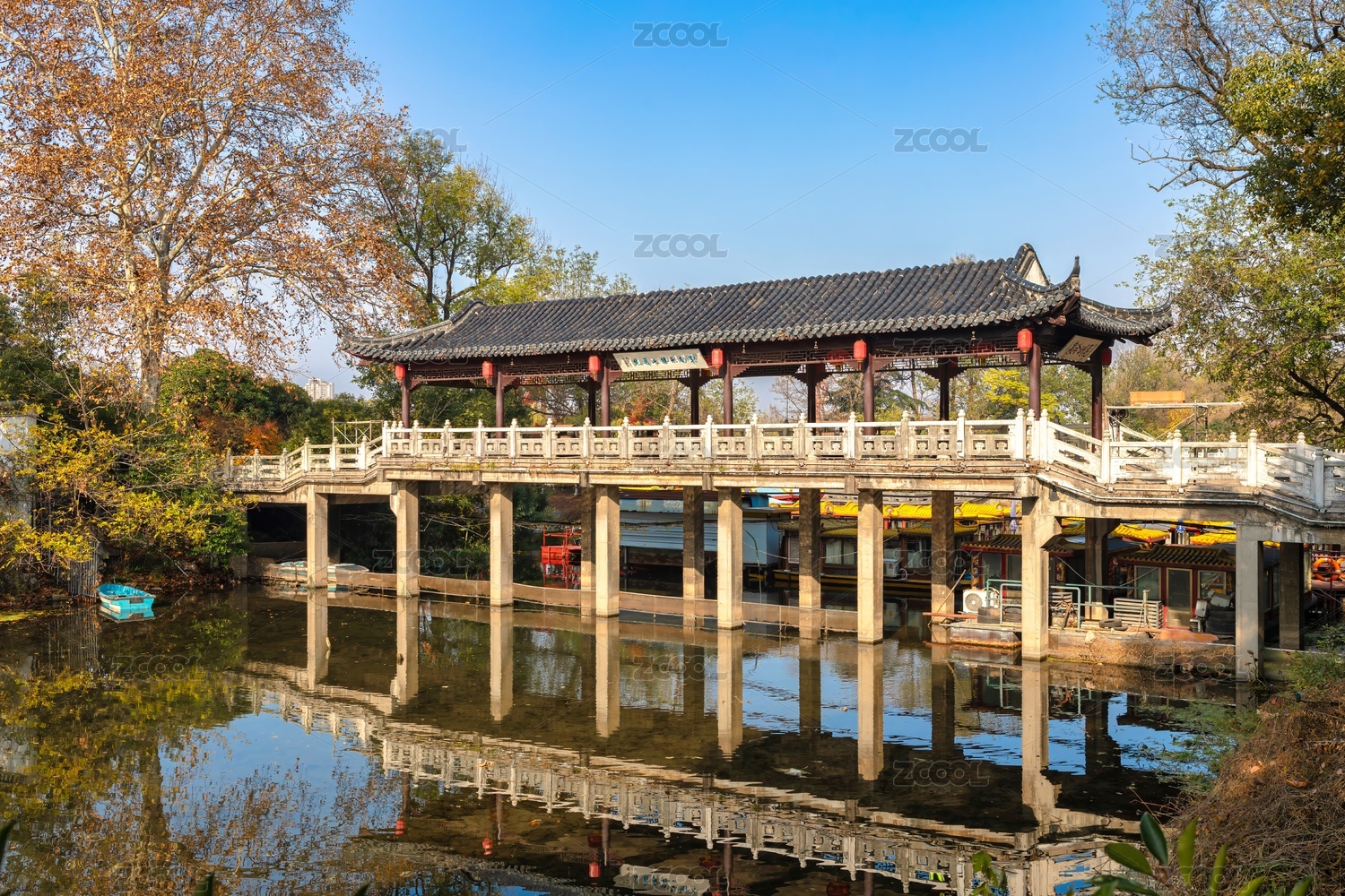 中国浙江杭州西湖花港观鱼濠上乐长廊秋景