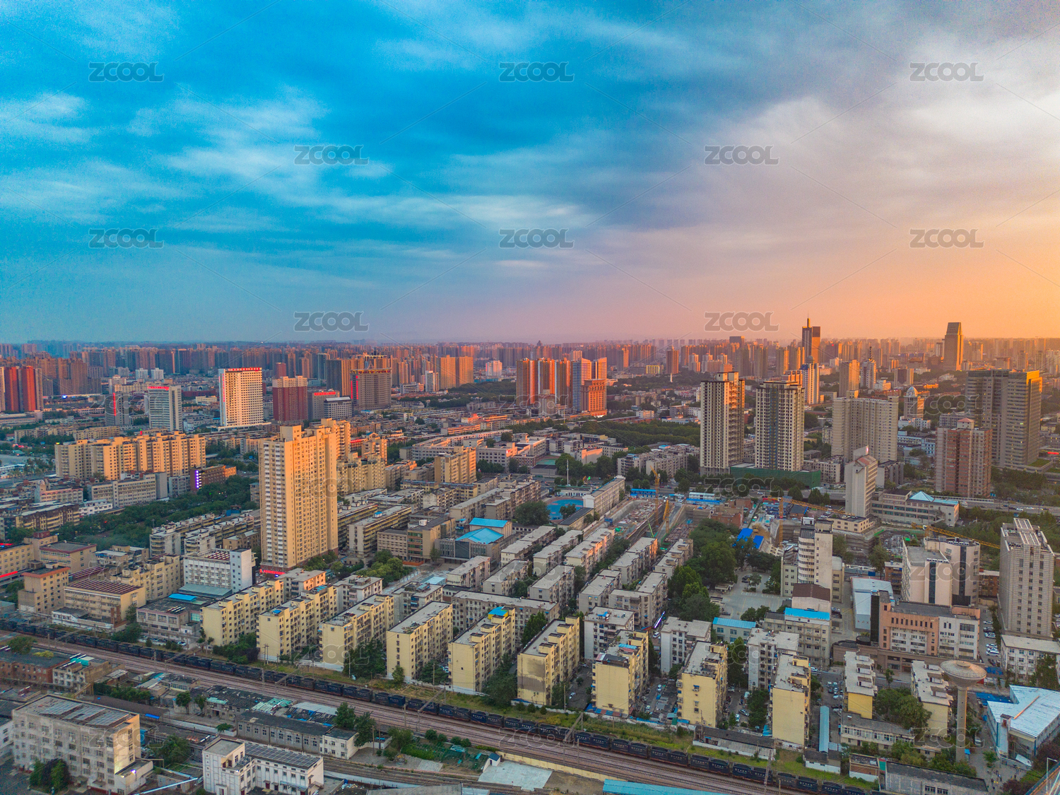 夕阳下俯瞰郑州的城市建筑和道路