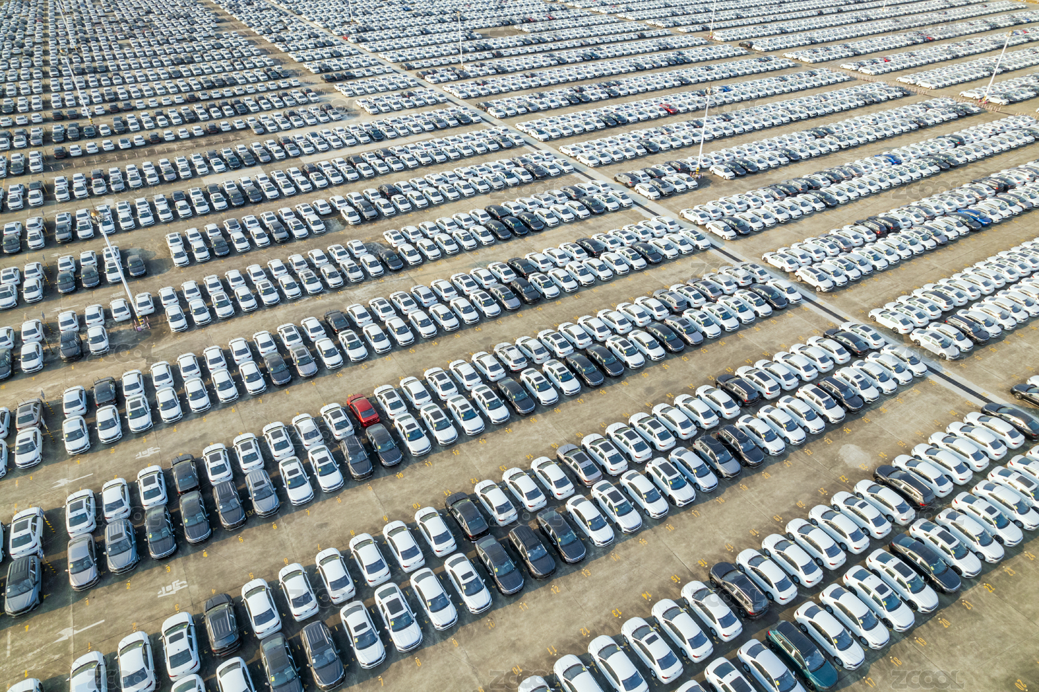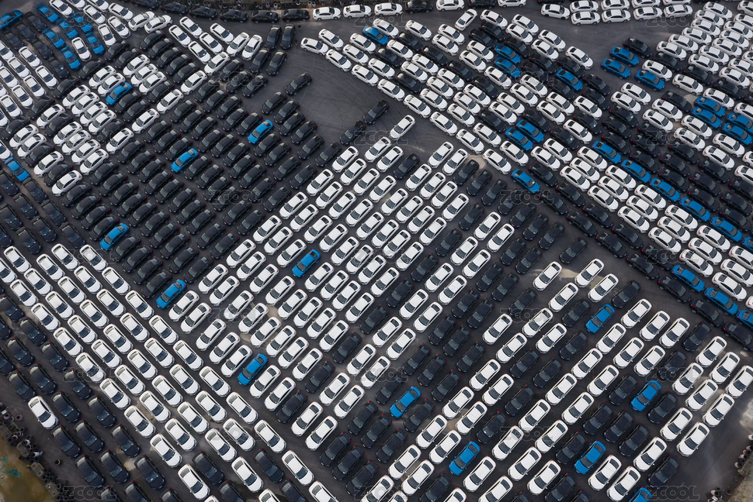 俯瞰四川成都汽车厂停车场里停放的密集汽车