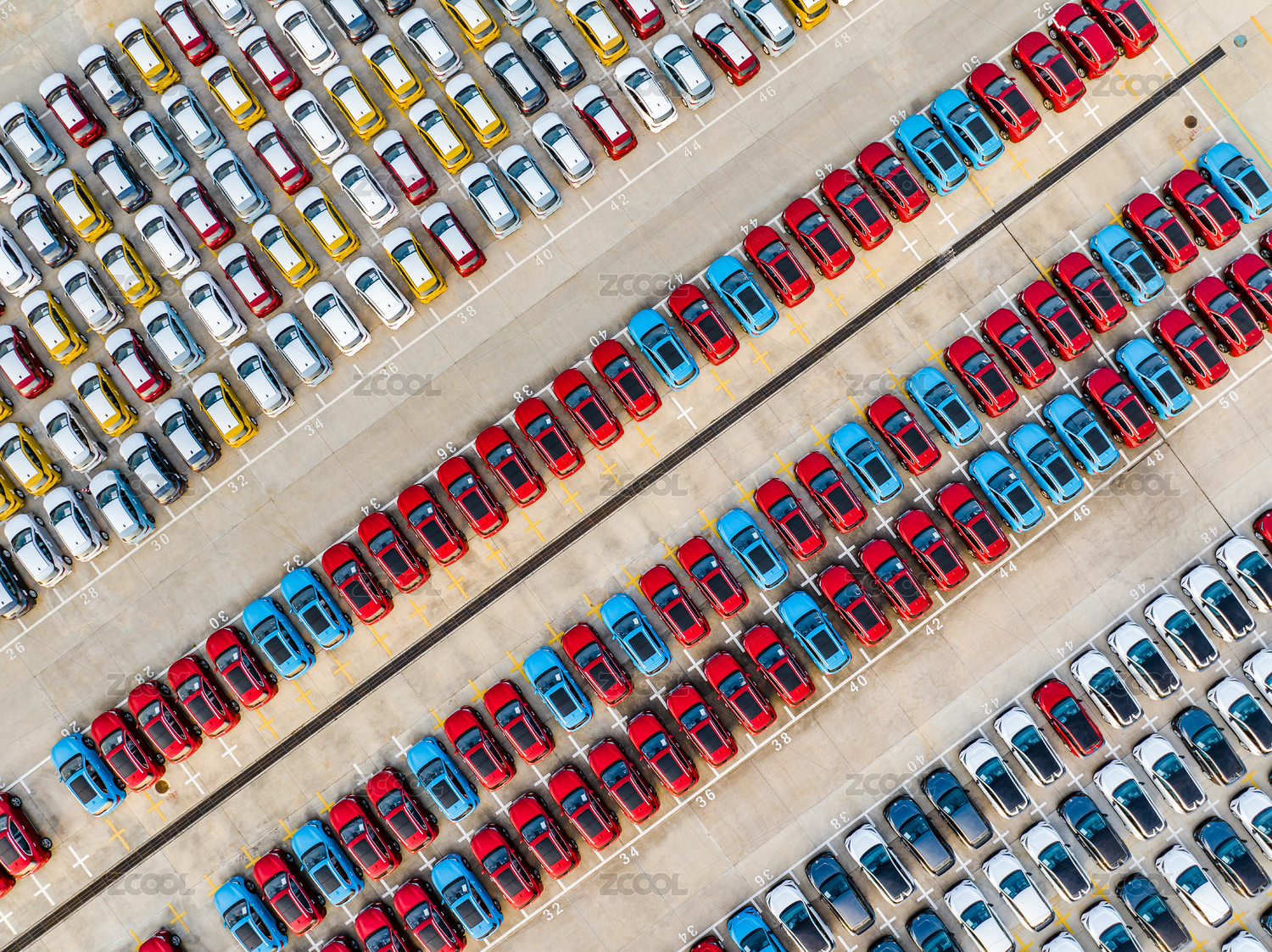 航拍晴天里的汽车生产基地里整齐停放着的等待出厂的汽车