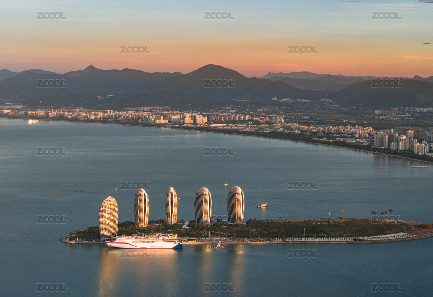 Aerial View of Cruise Home Port and Luxury Hotels on Phoenix Island, Landmark Architecture of Sanya City, Hainan Province, China