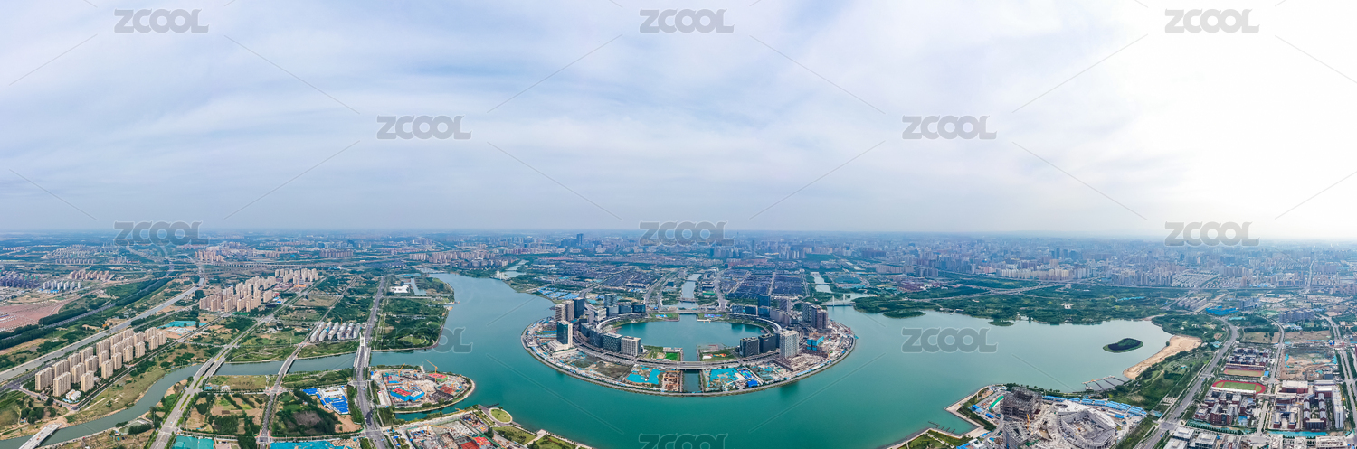 航拍河南郑州郑东新区北龙湖金融岛环形建筑