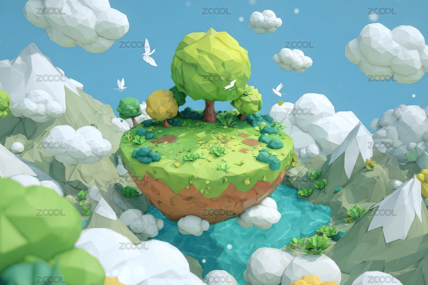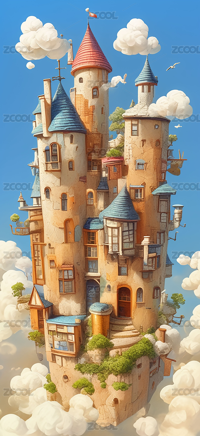 春天鸟房子创意树屋水池植物微场景插画秋天