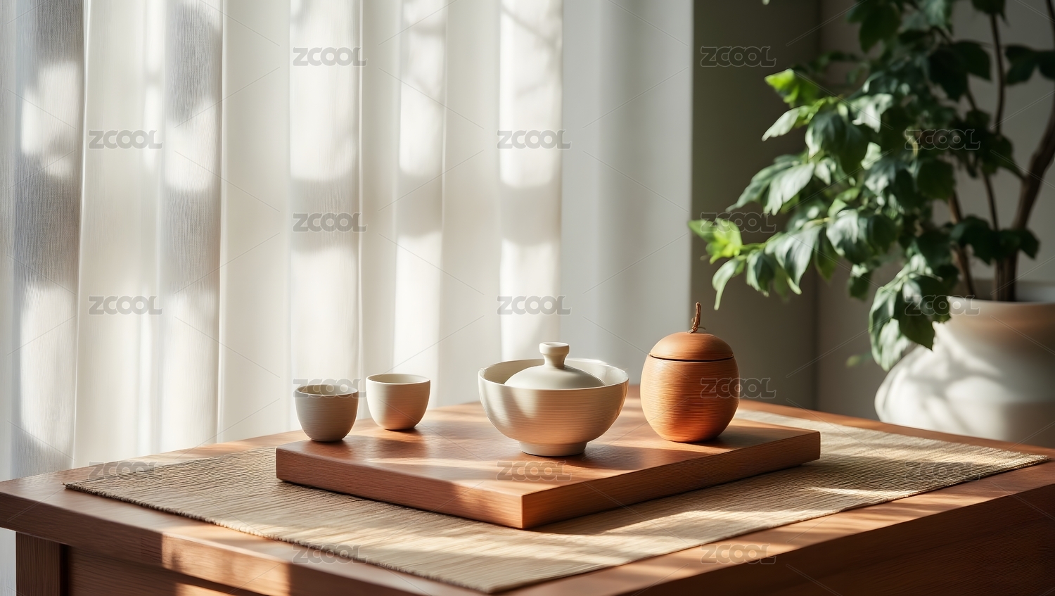 放在春日绿植里木桌上的玻璃杯里的茶水