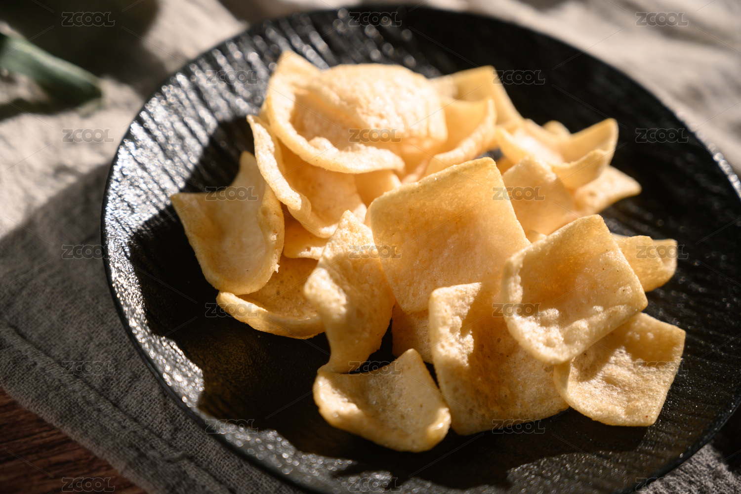 桌面上的白色陶瓷盘子里的美味可口的山药片