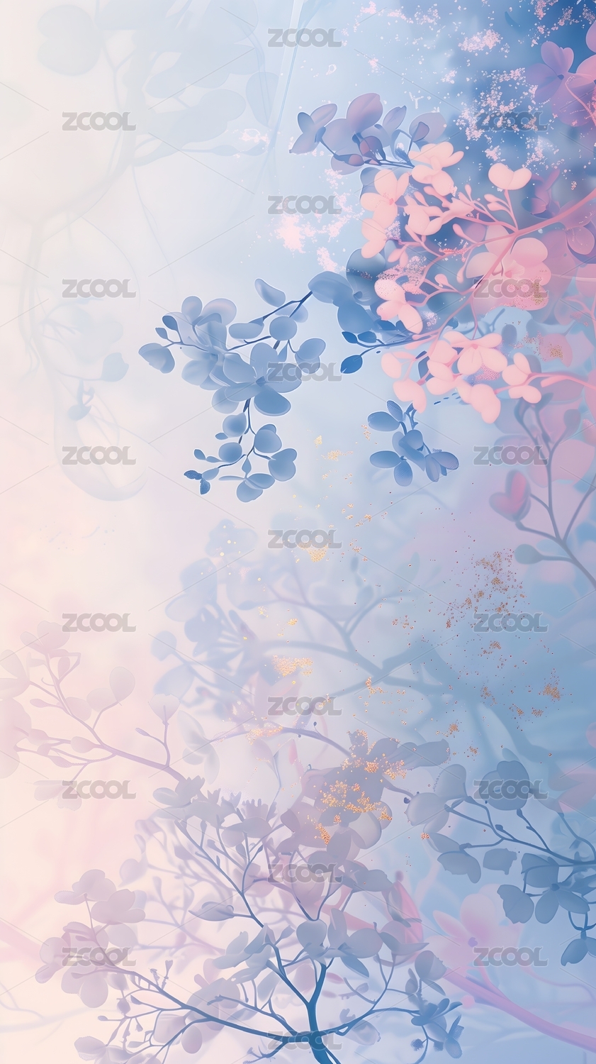 水彩粉蓝金箔植物叶片背景图