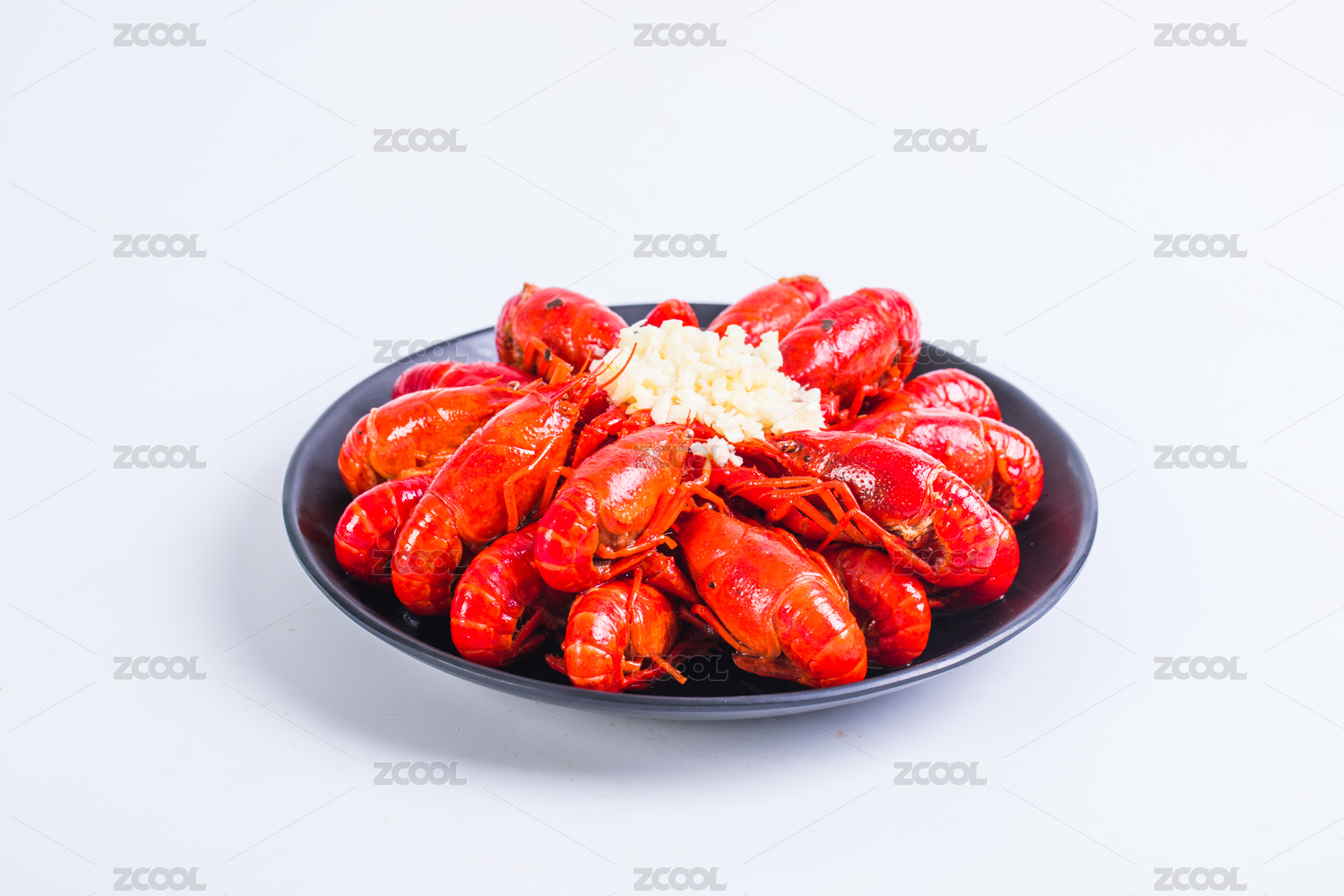 黑色盘装的美味蒜蓉小龙虾放在白色背景上
