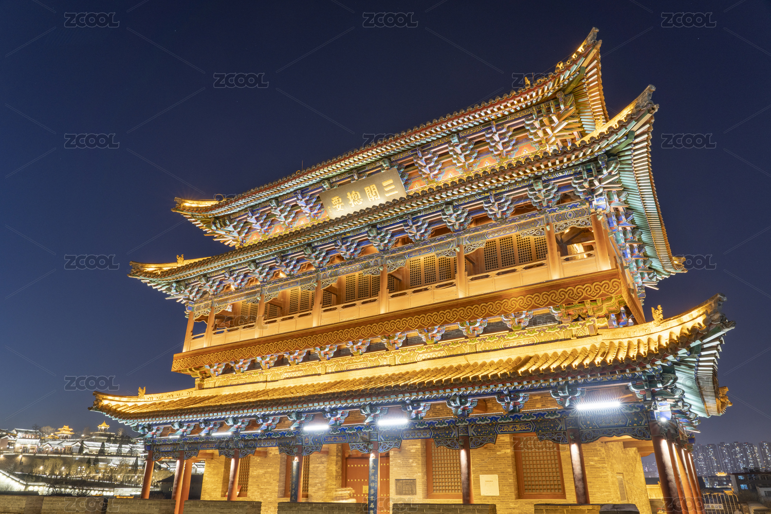 中国山西省大同市夜晚灯光古城墙园林建筑