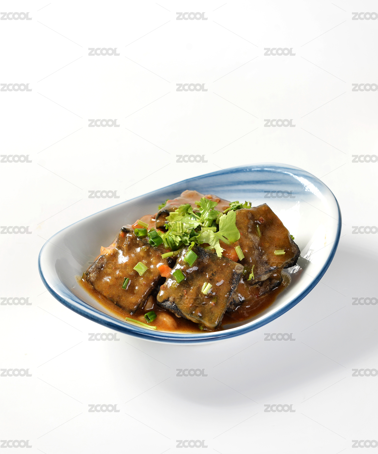 桌面上的盘子里的美味可口的凉拌鱼皮