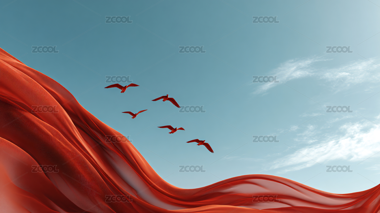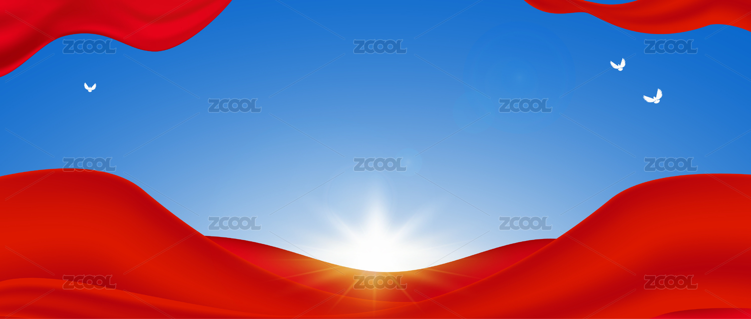 通用蓝天白云牡丹和平鸽红旗红色背景