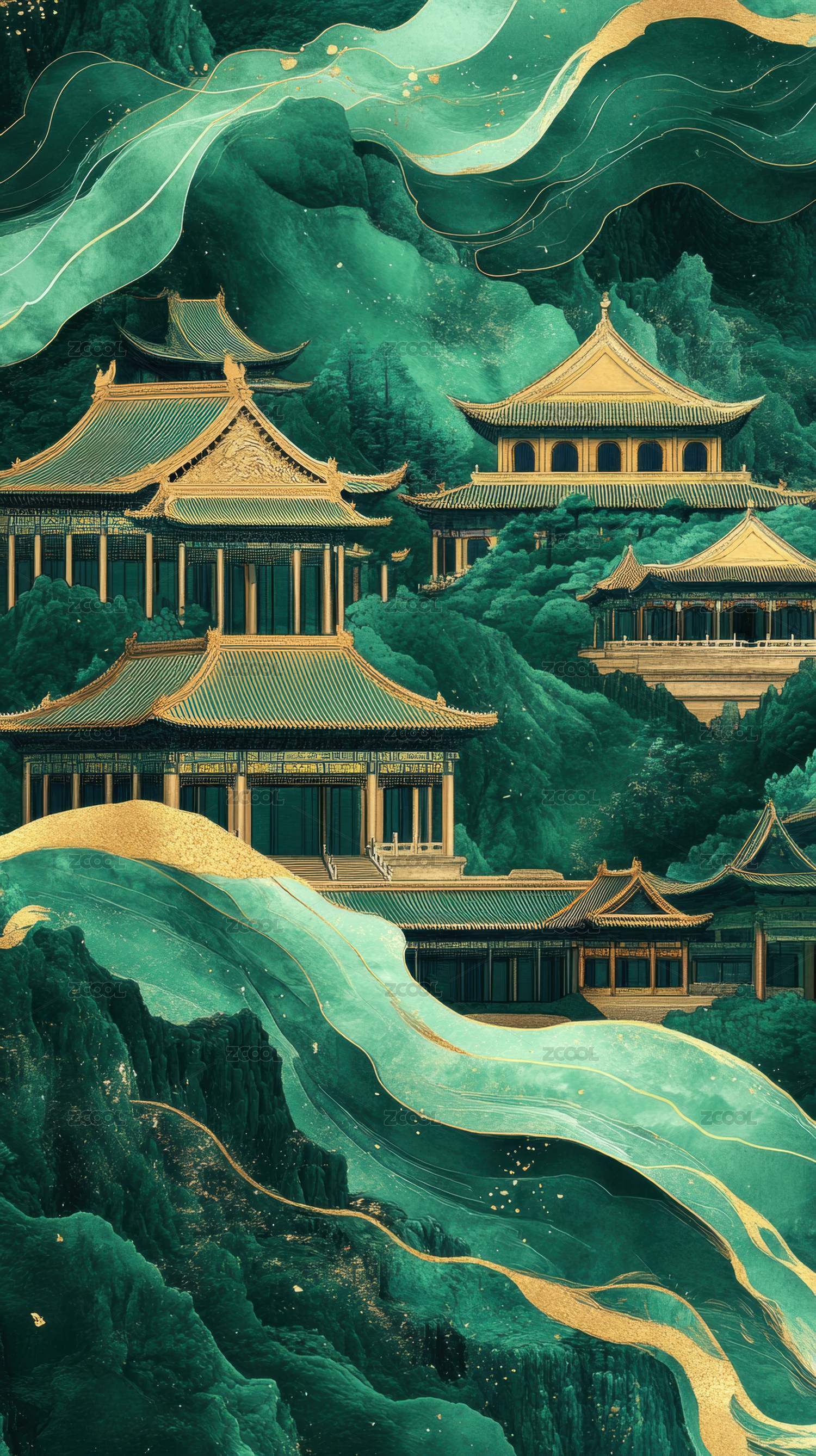 金色楼阁掩映在碧绿山峦间