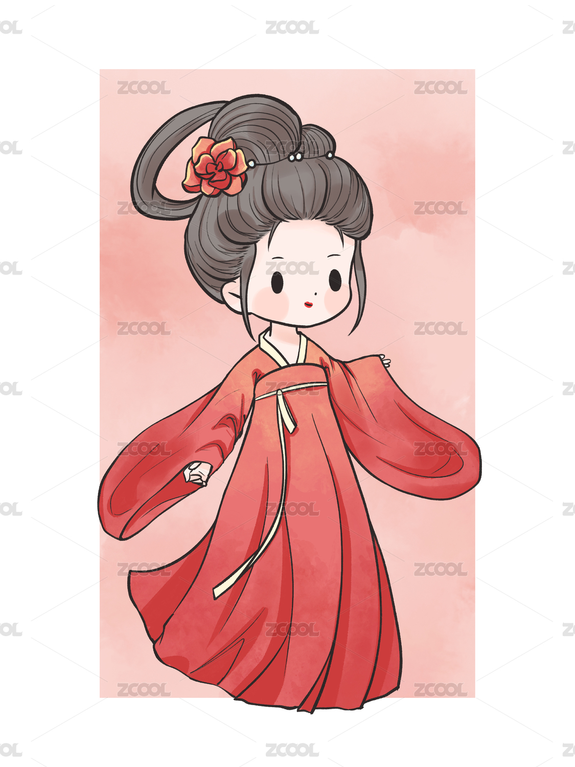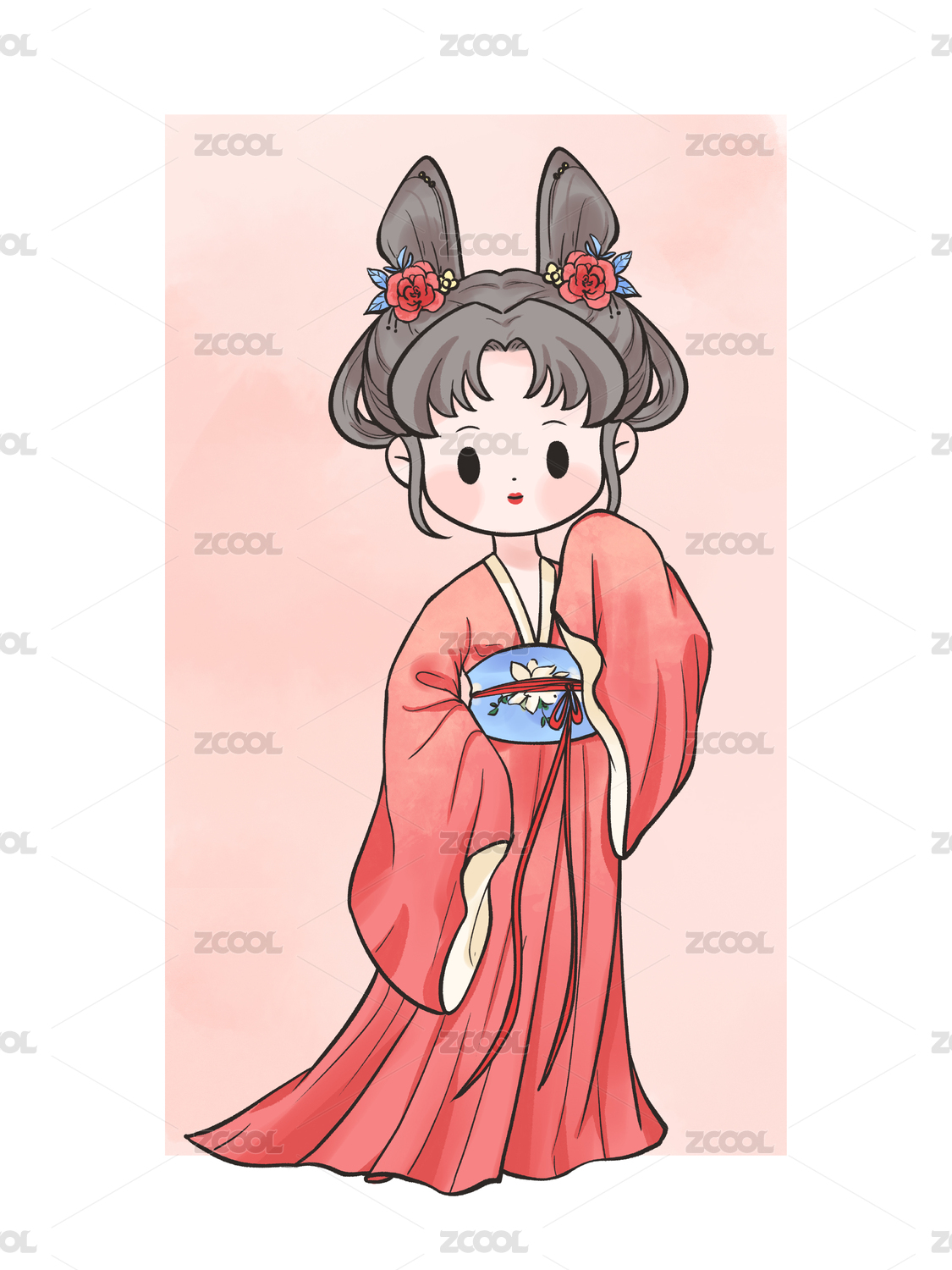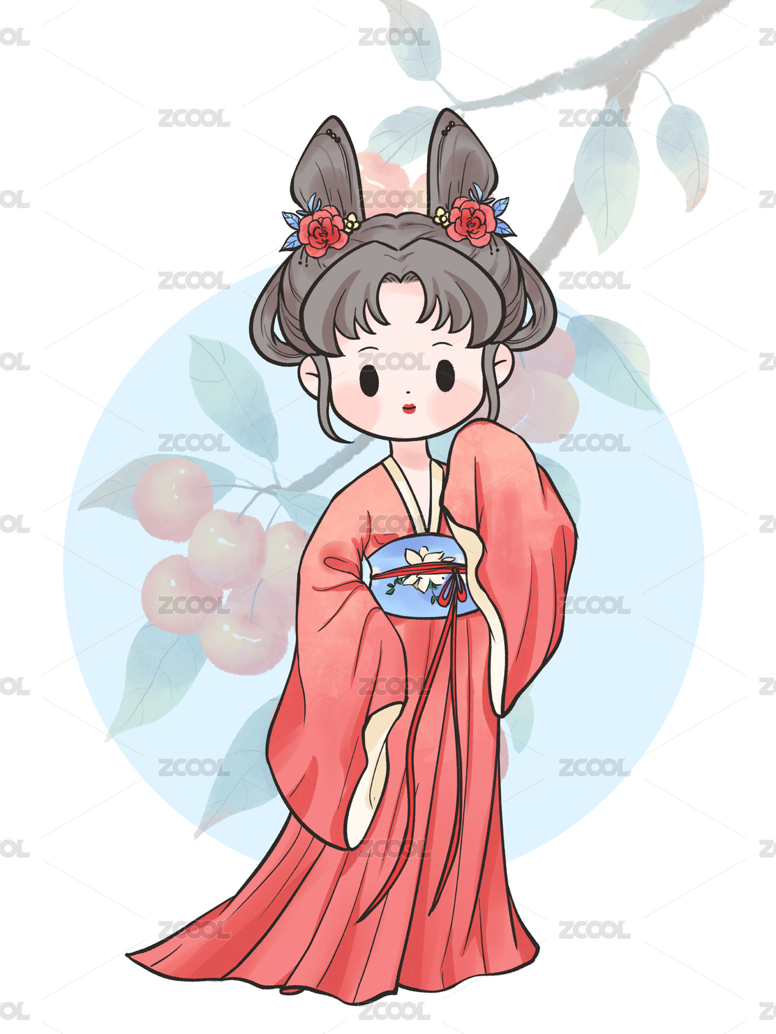 古风手绘Q版红色汉服女孩拿拨浪鼓过年