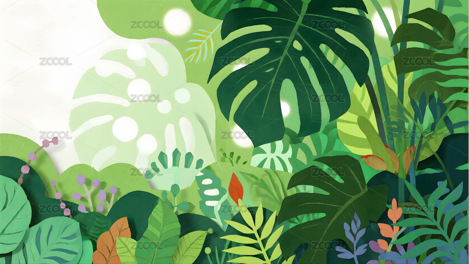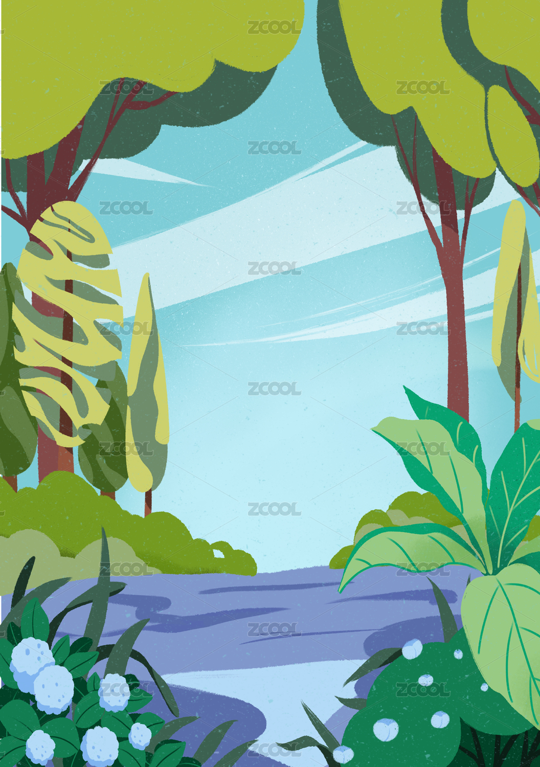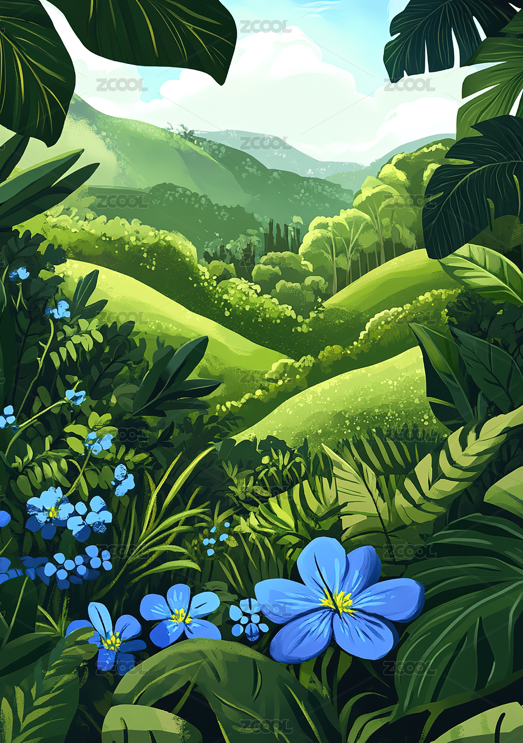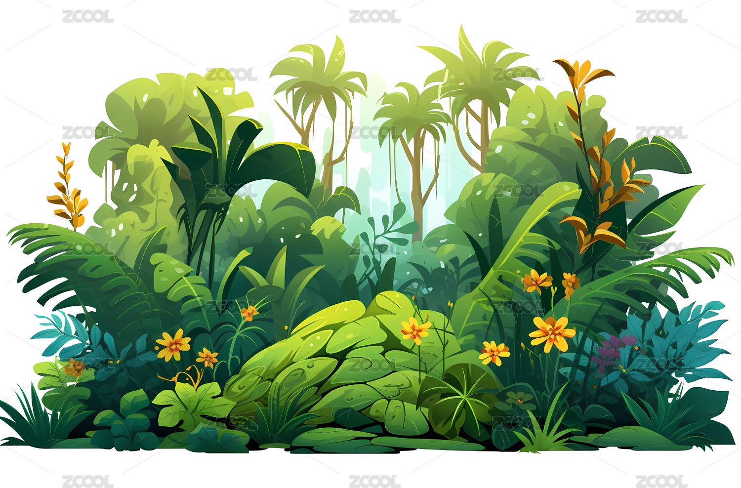 夏天森林中植物茂盛场景插画