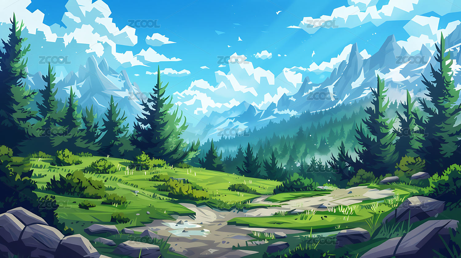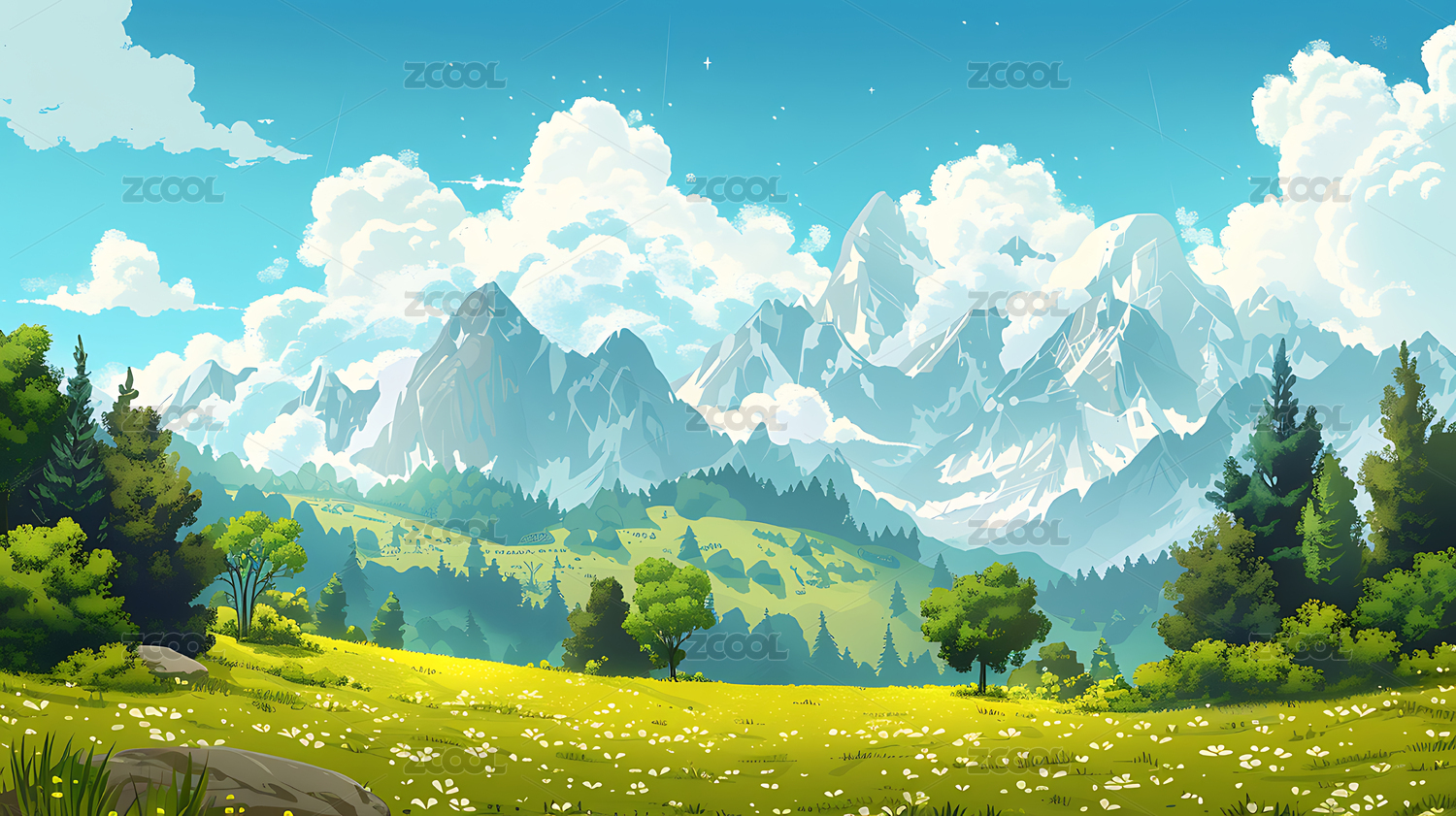 卡通草地远山自然风景