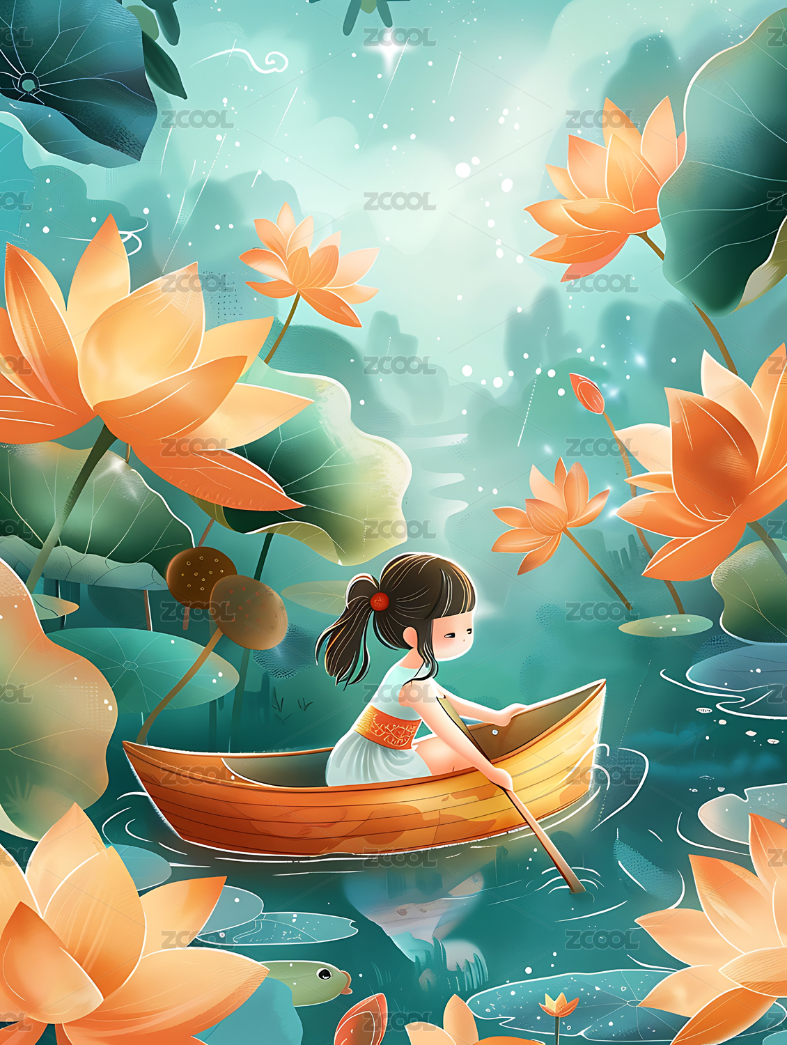 夏天立夏一个小孩在荷花池中划船唯美插画