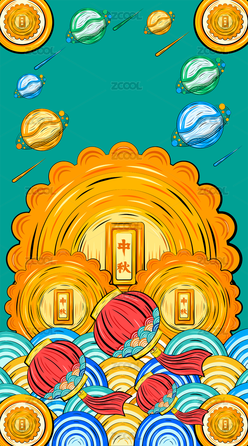 国潮中秋月饼灯笼送福云纹星空矢量插画海报