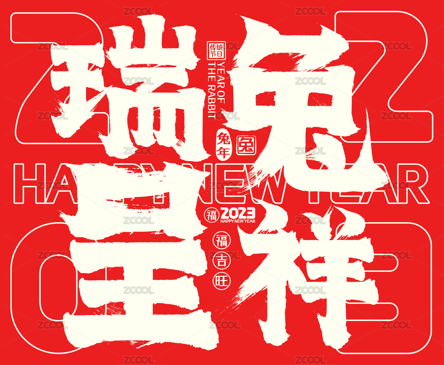 2023玉兔呈祥喜庆中国红兔年春节毛笔字