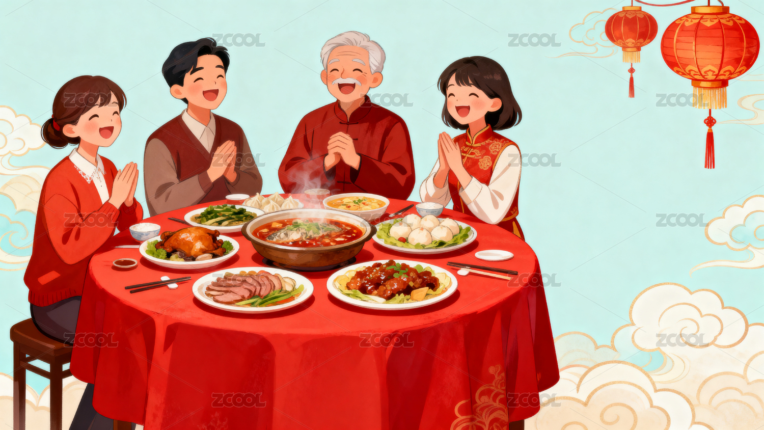 一家人除夕夜吃年夜饭插画背景