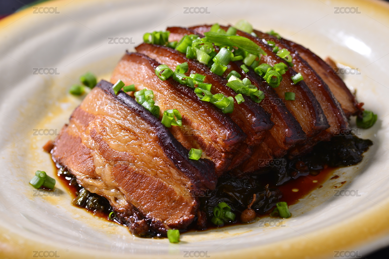 白盘里的梅菜扣肉干咸菜扣肉烧白