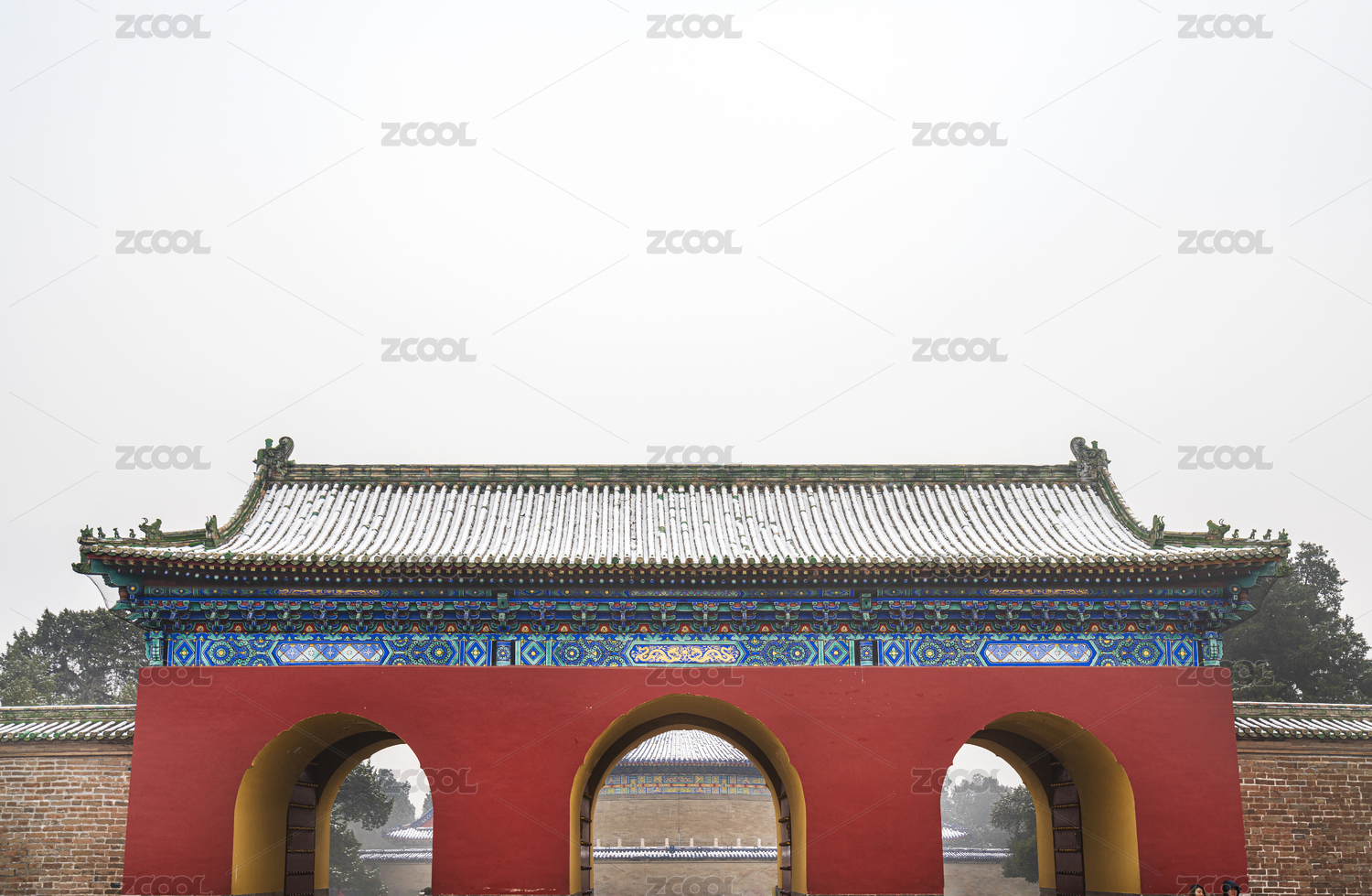 冬季北京雪后天坛成贞门视角看祈年殿建筑群