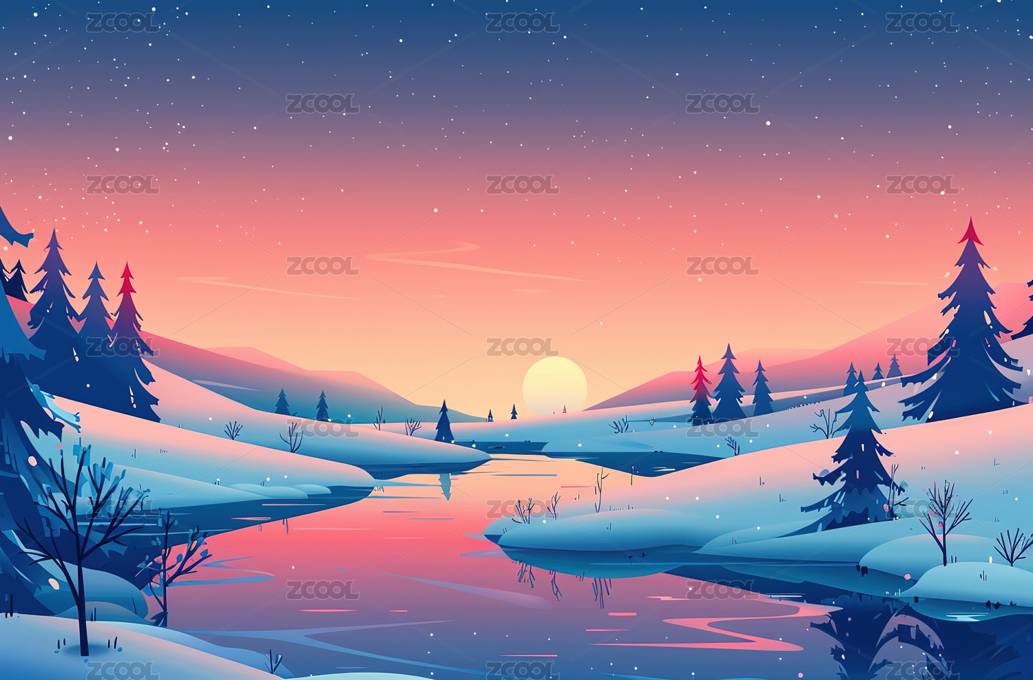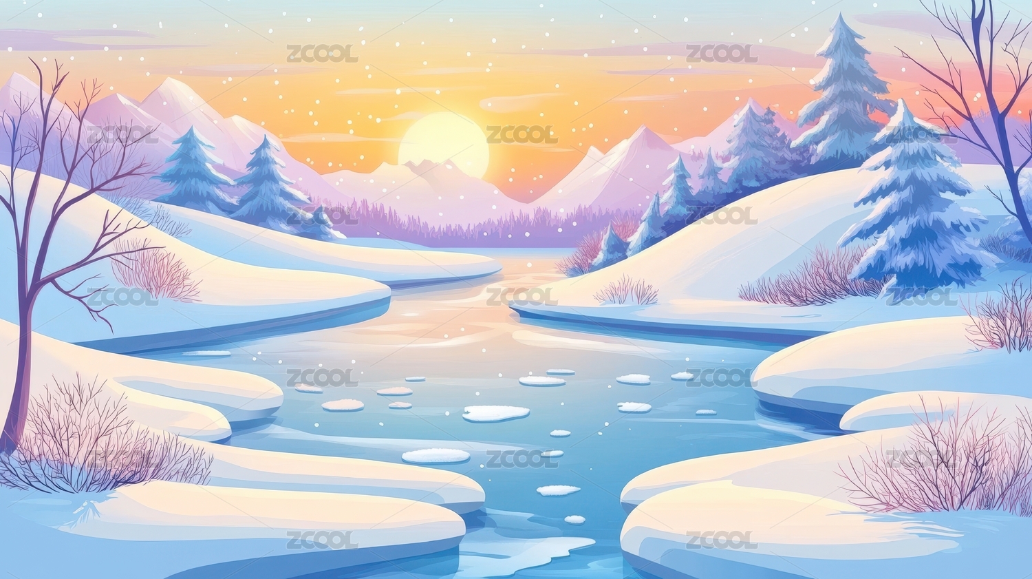 冬季大雪节气插画,雪景中的冬天河流场景插