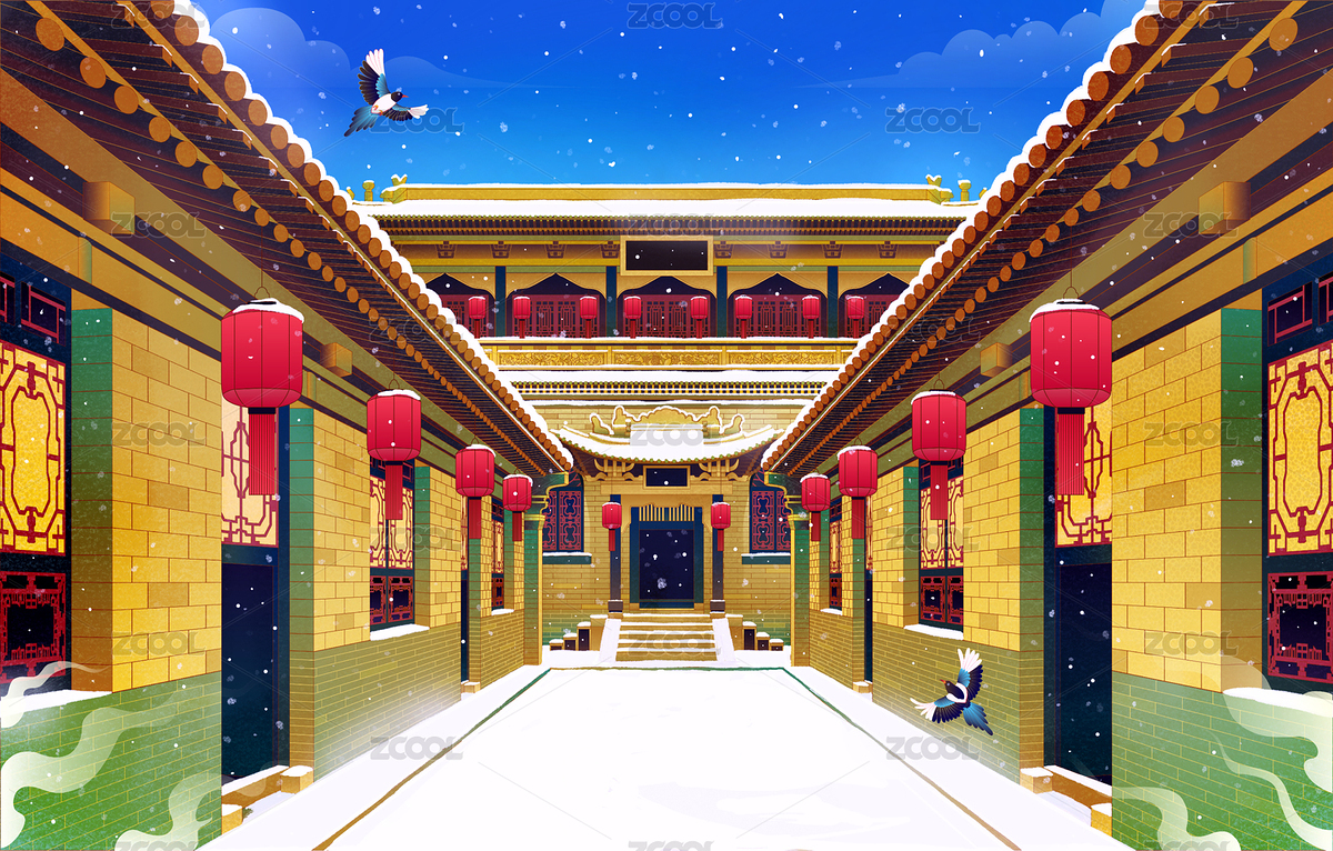 山西晋中乔家大院冬天雪景国风插画