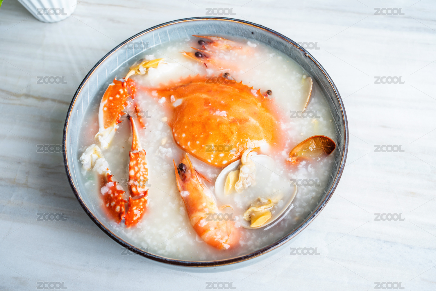 中国美味海鲜粥,厨房台面上一碗虾蟹粥