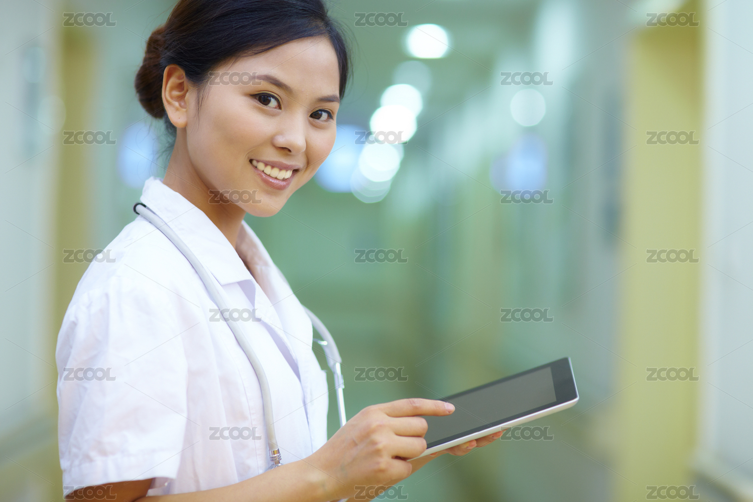 自信的年轻护士拿着移动平板电脑在看相机与诊所的女医生站在窗前。