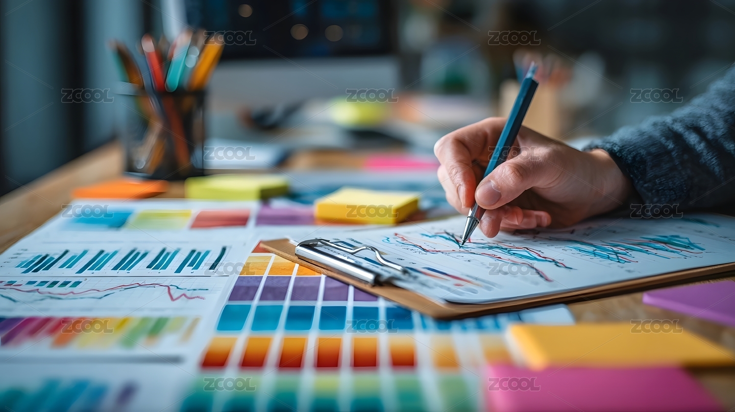 年轻的混血中国亚洲女子用绿颜色的铅笔画写生生产办公工作室。职业和职务侵占的概念。