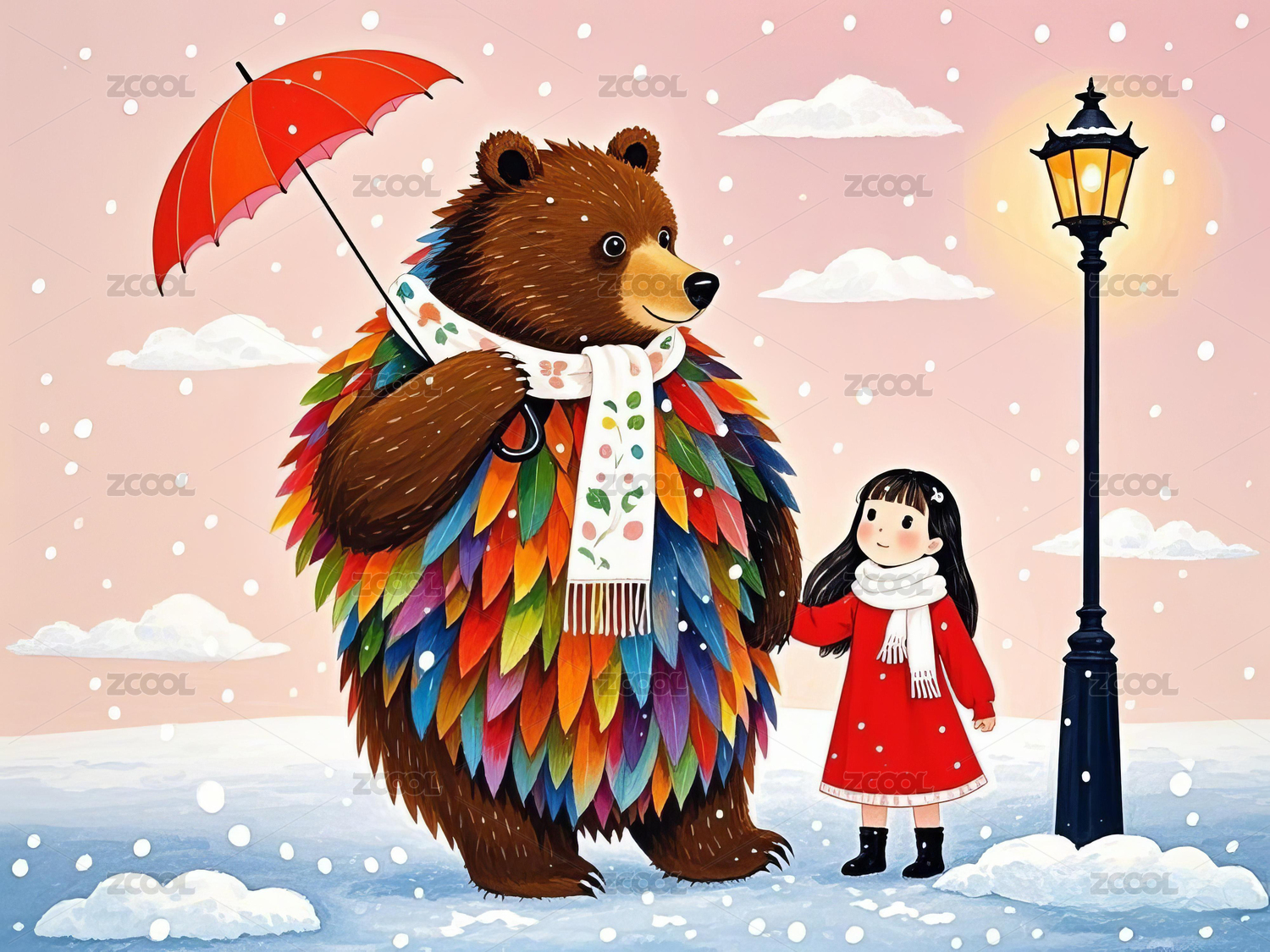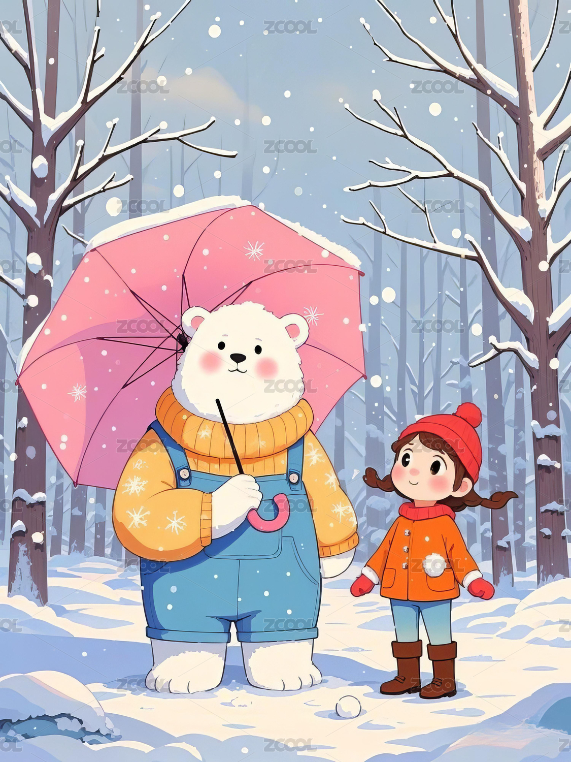 冬季里拿着雨伞的大白熊和小女孩