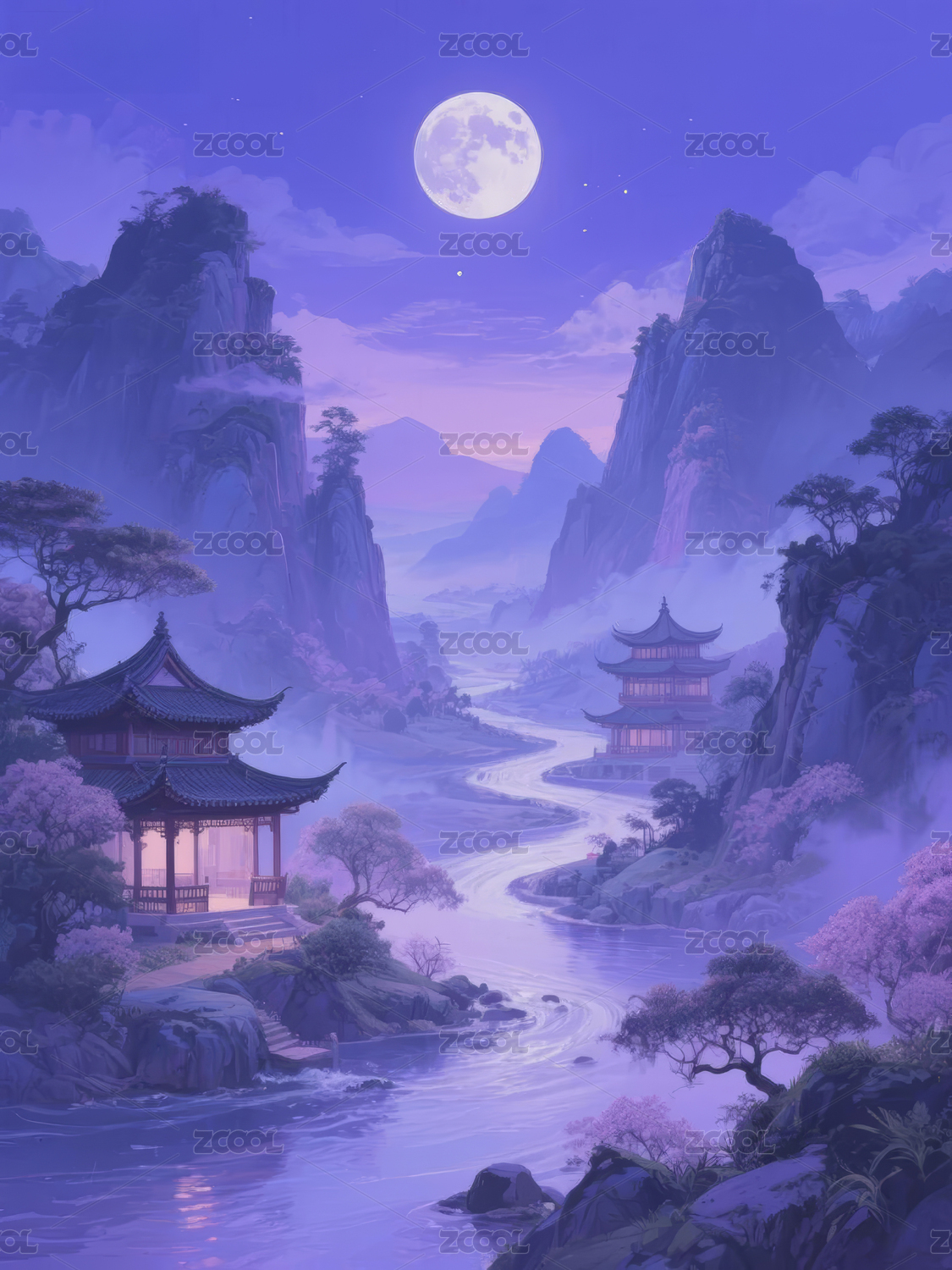 中国山水亭台建筑风景月夜插画