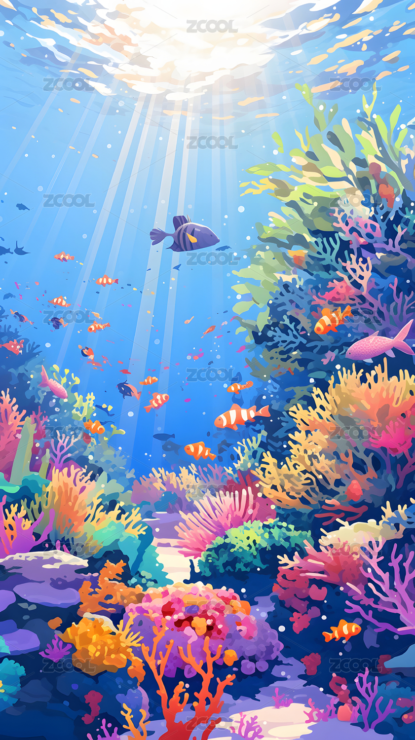 q版,彩色,高清,动物,儿童,插画,海底,鱼群,珊瑚,海藻