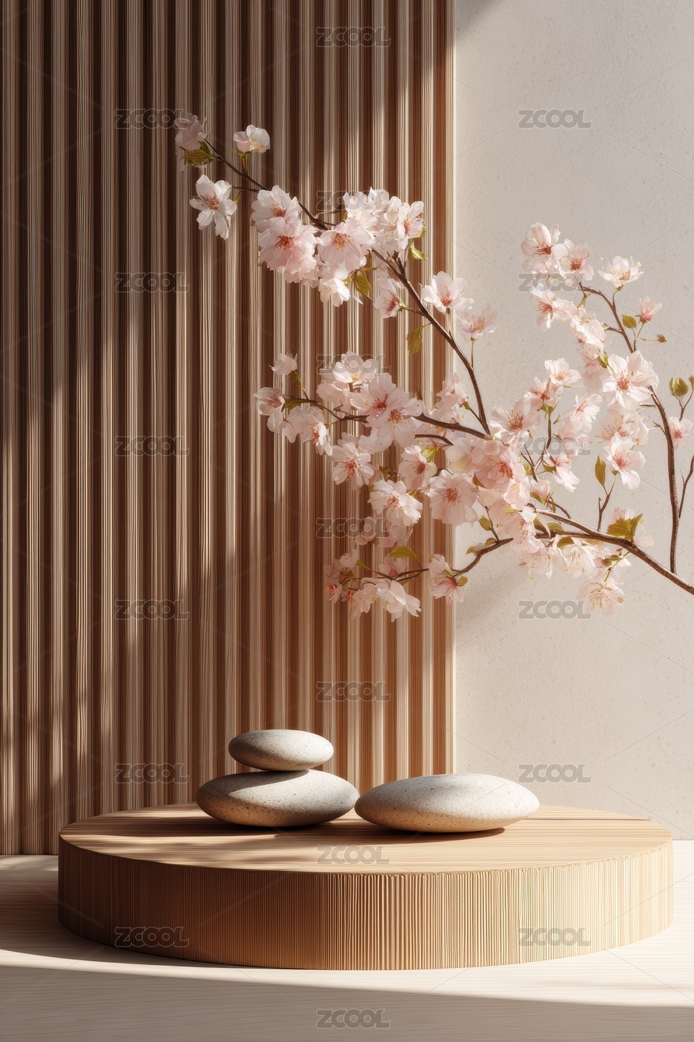 樱花与禅意石的和谐构图