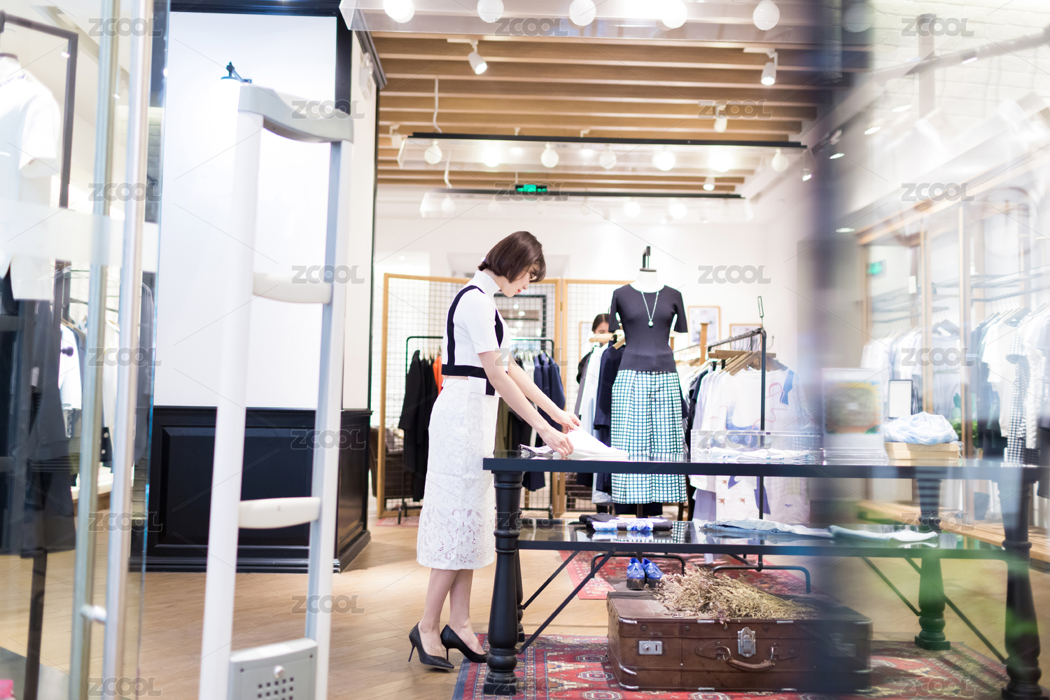 年轻漂亮的年轻女性在商场寻找挑选试穿服装