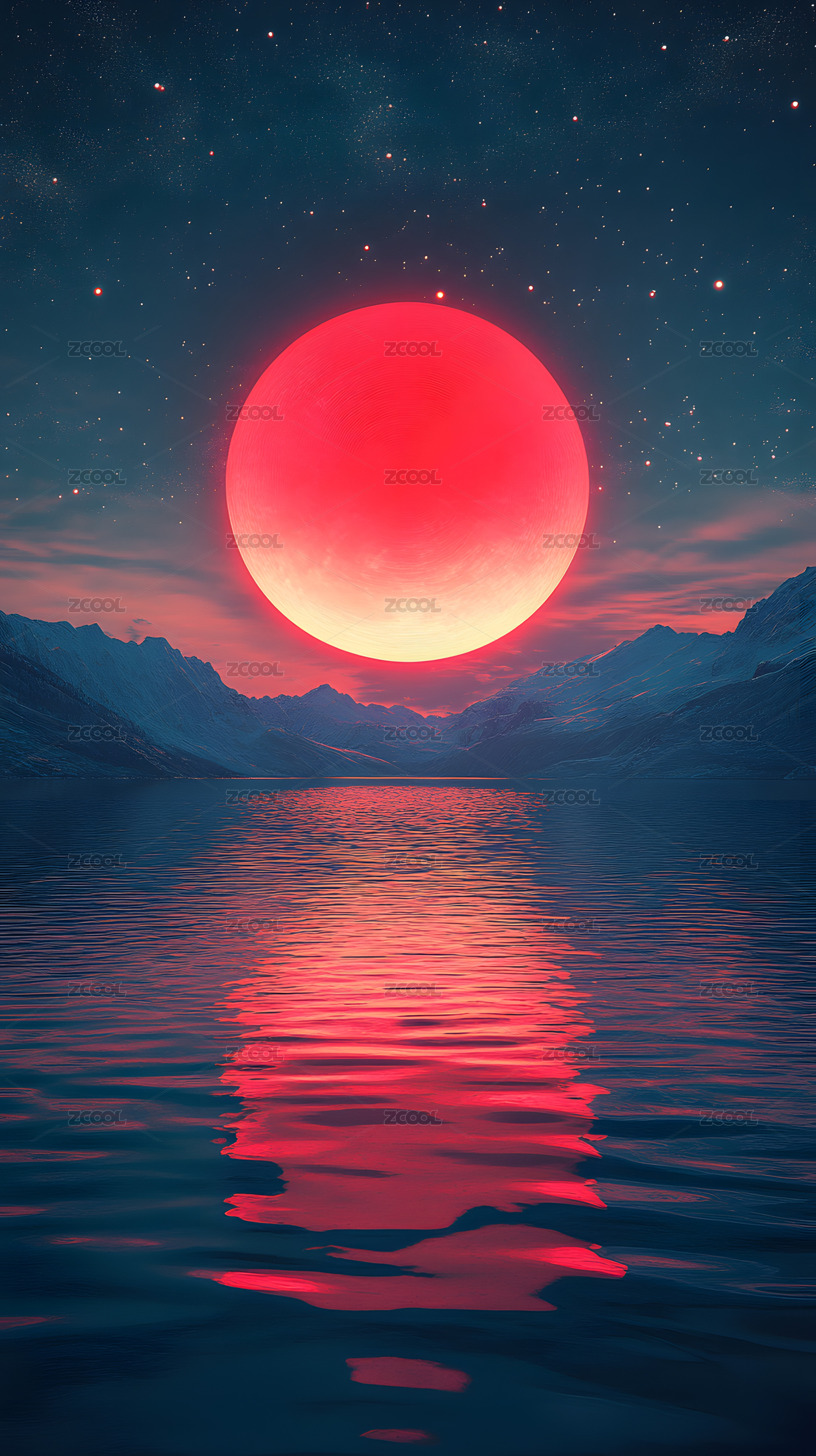 绯红星球升起水面倒影