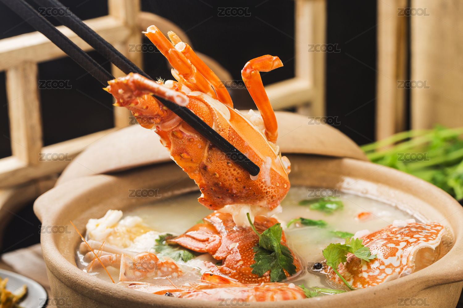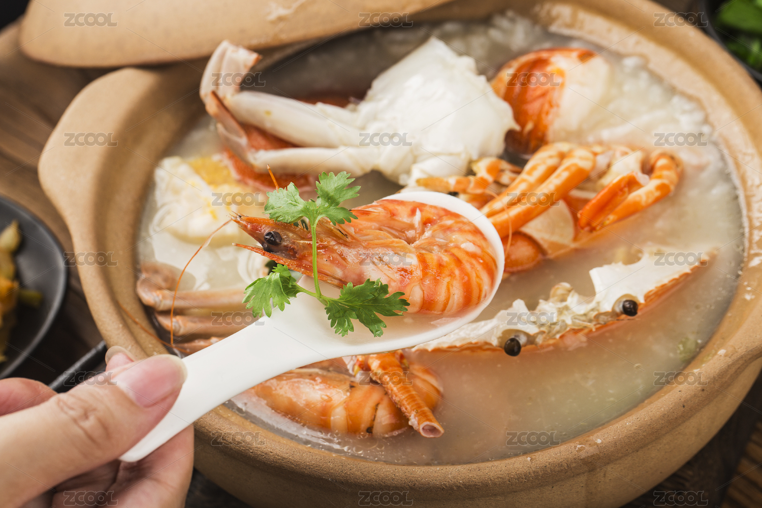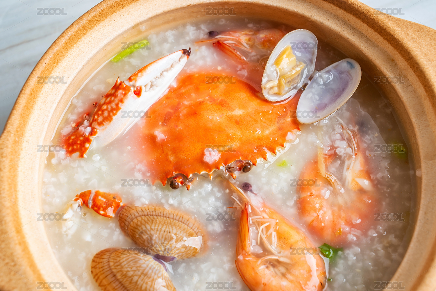 中国潮汕砂锅粥,厨房台面上一锅虾蟹海鲜粥