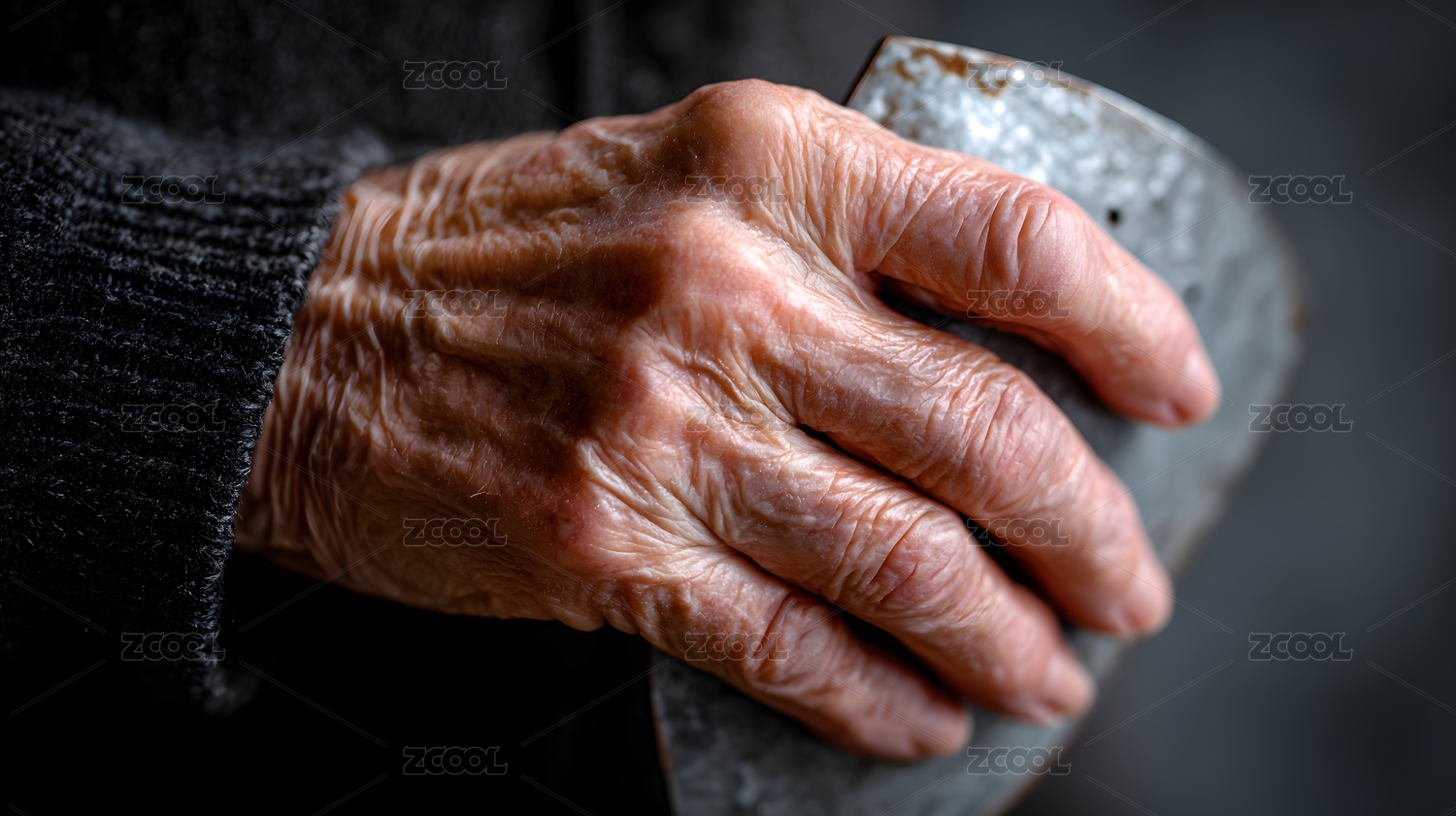 老人手握旧熨斗的特写