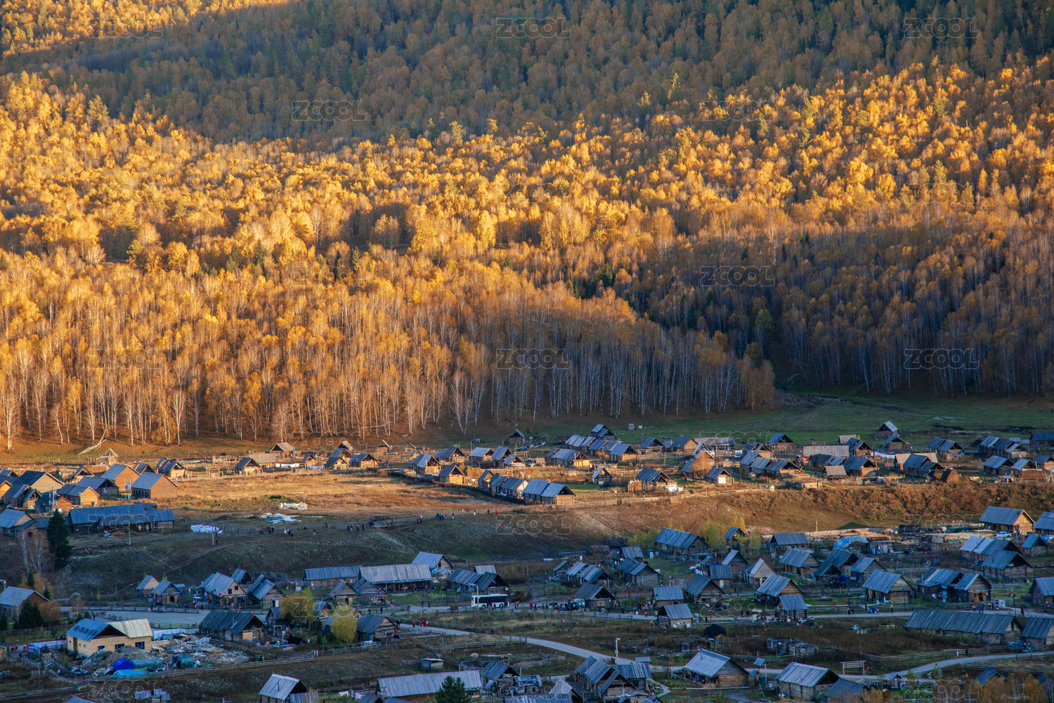 中国新疆喀纳斯景区禾木村落的金秋美景
