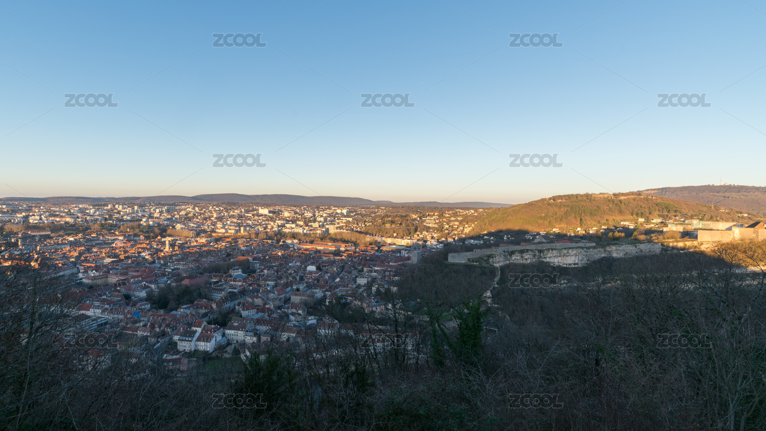 法国小镇贝桑松和贝桑松城堡黄昏航拍风景