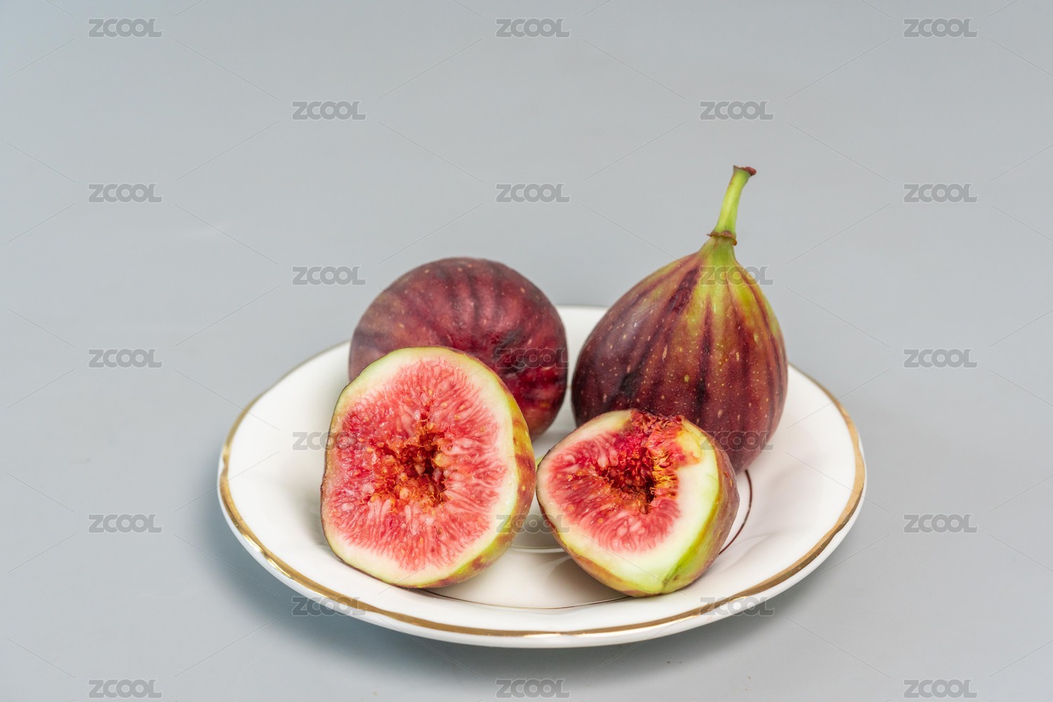 白色背景板上摆放着一个完整的和半个切开的无花果