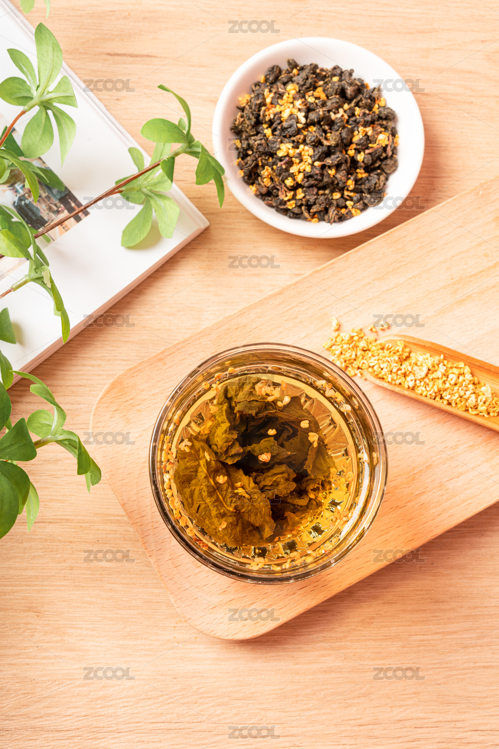桌面上的杯子里的甘甜可口的茉莉吐珠茶
