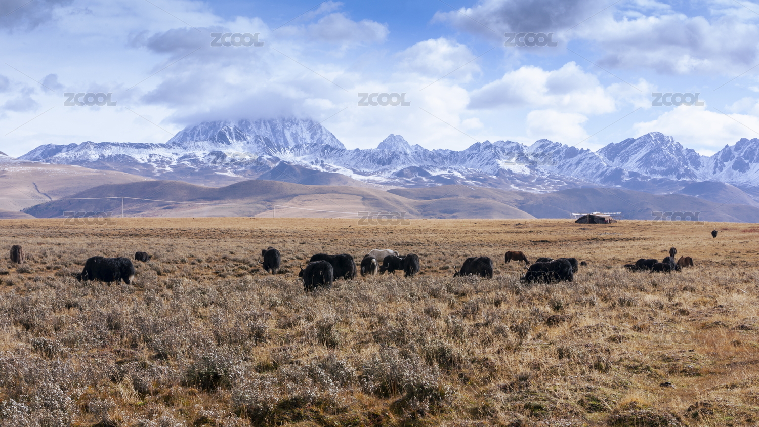 中国四川新都桥塔公草原蓝天白云雪山高原风光