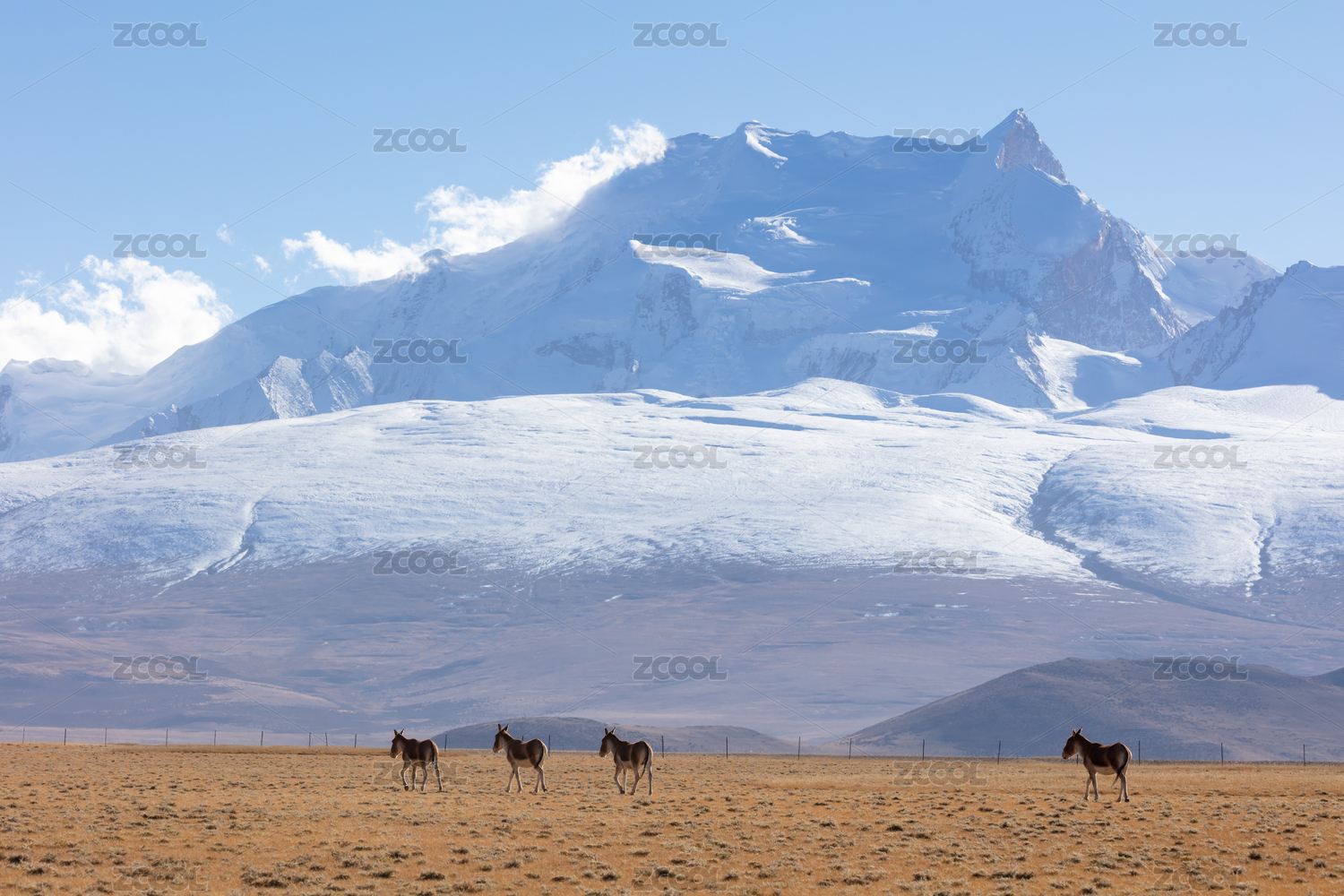 中国西藏希夏邦马峰和摩拉木青峰前的藏野驴