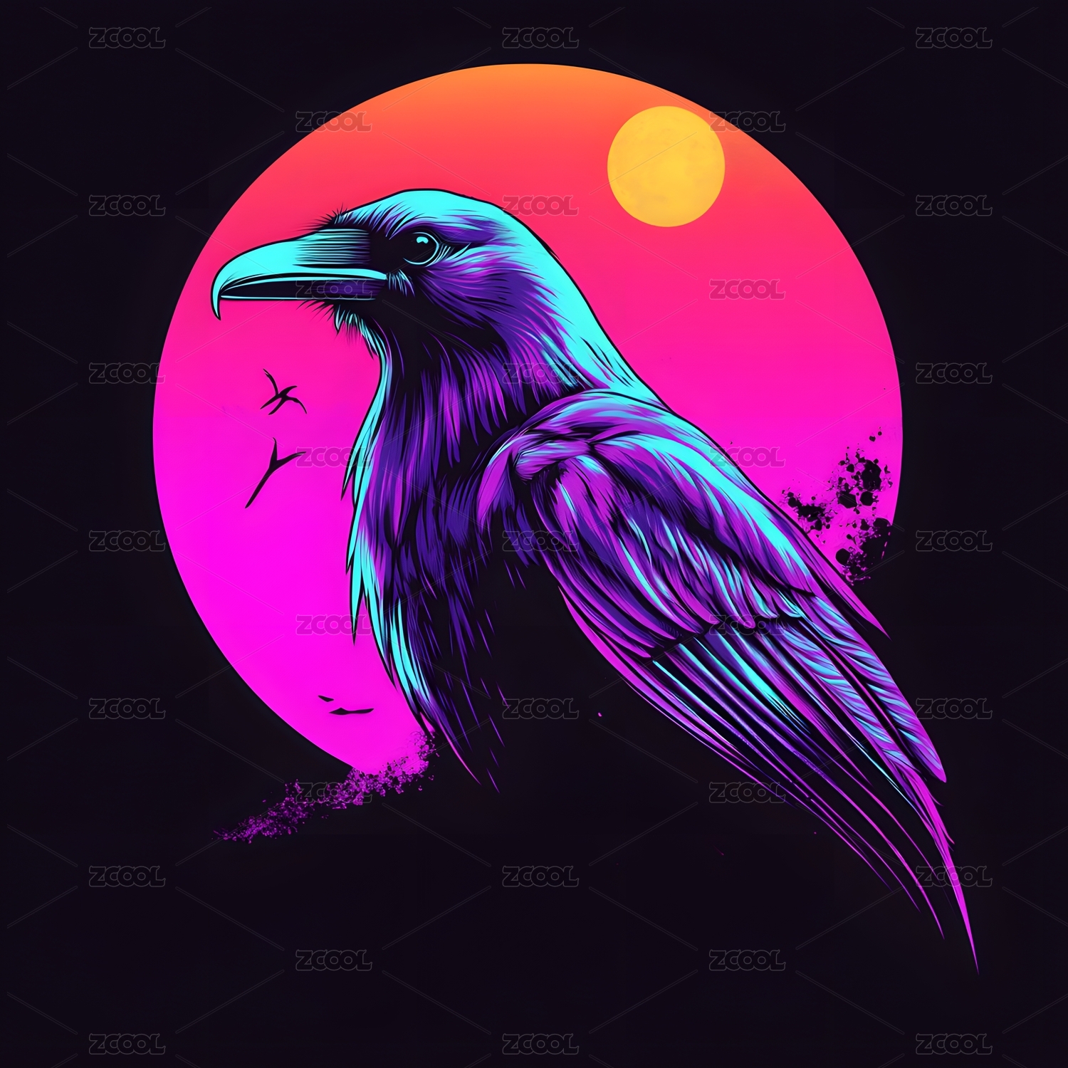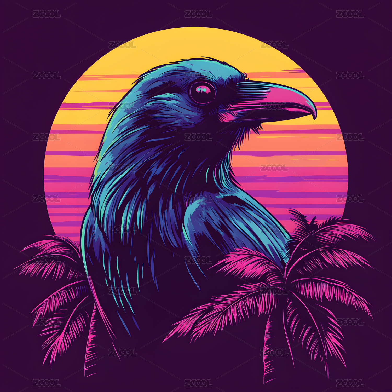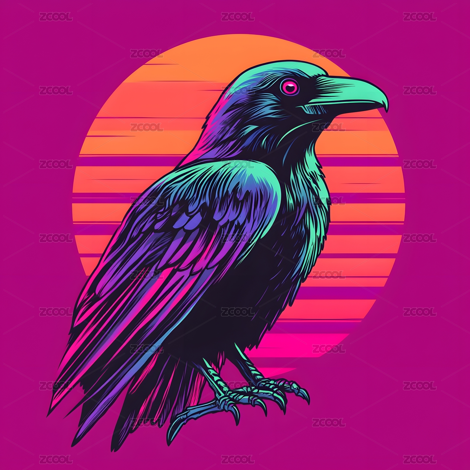 炫彩卡通复古蒸汽波风格乌鸦图案印花