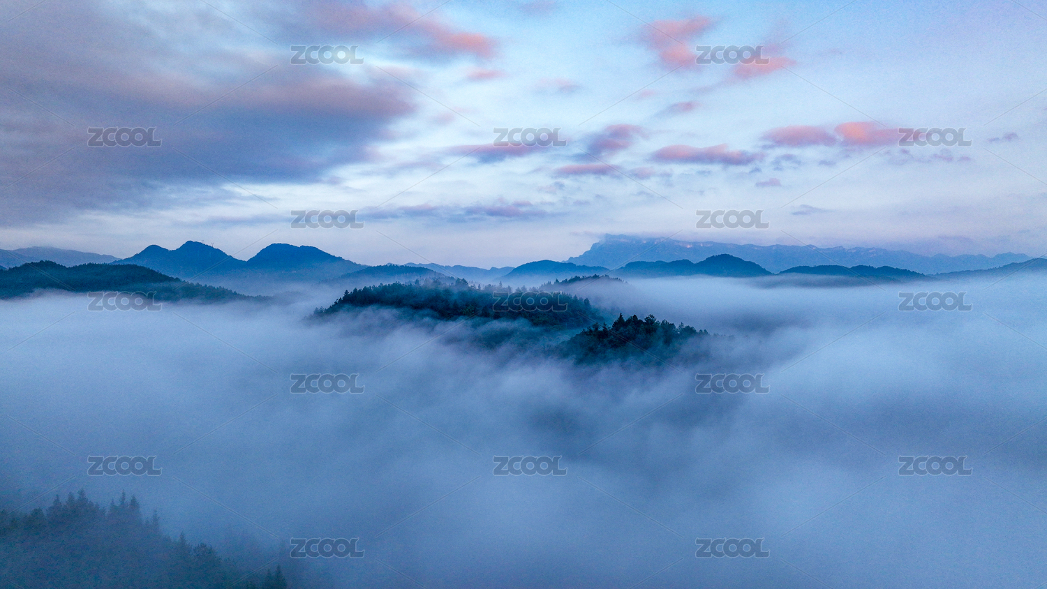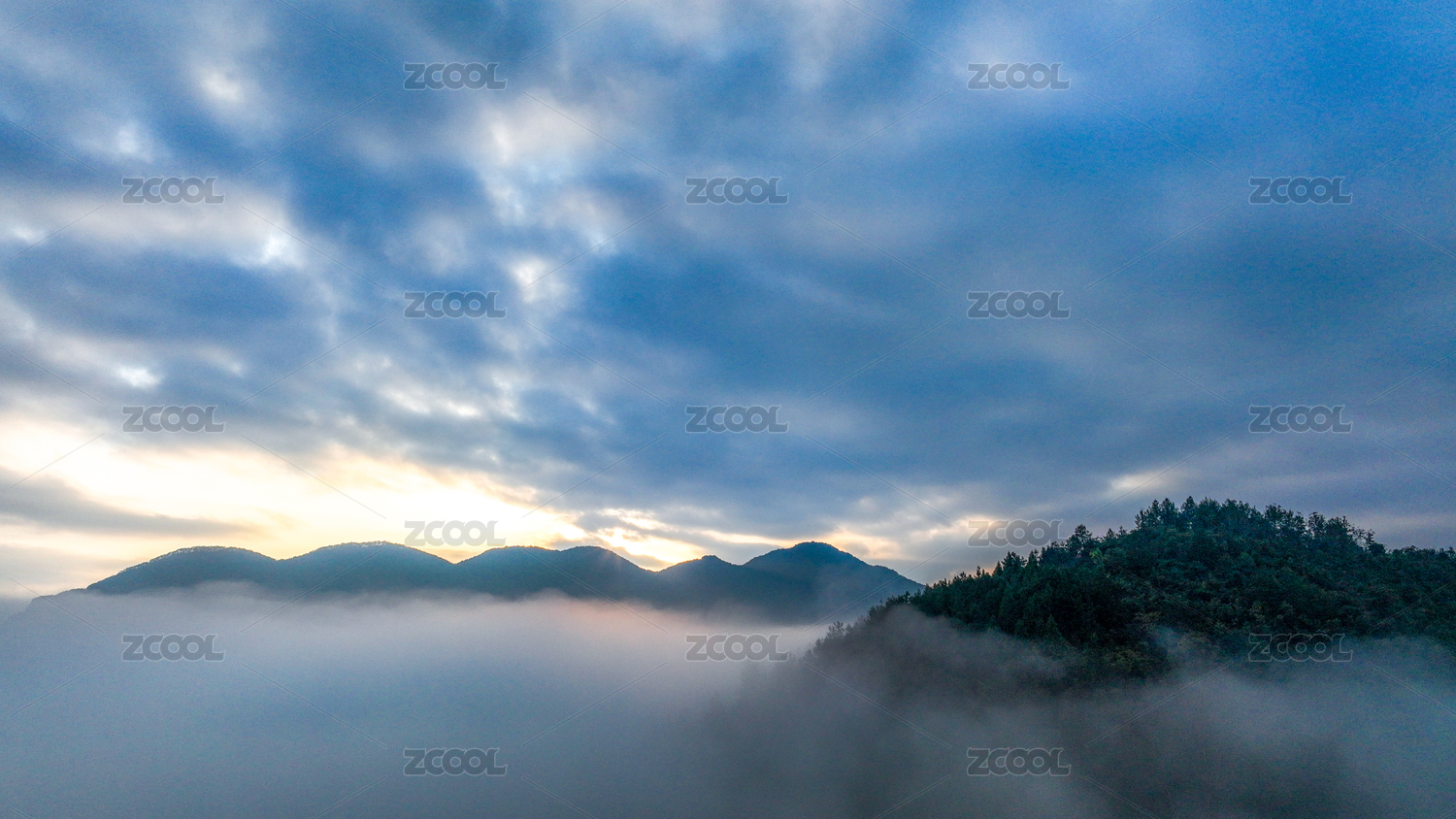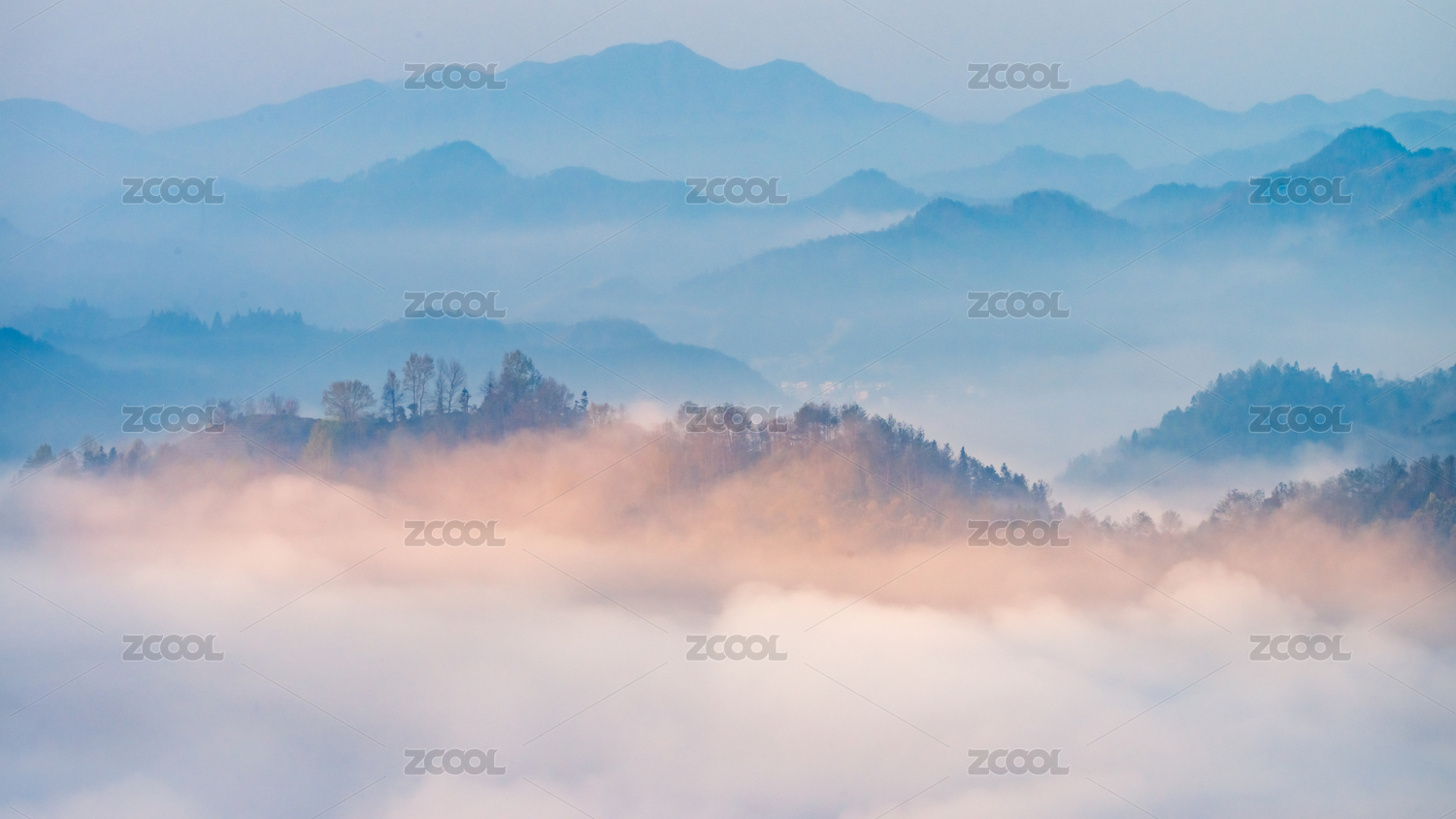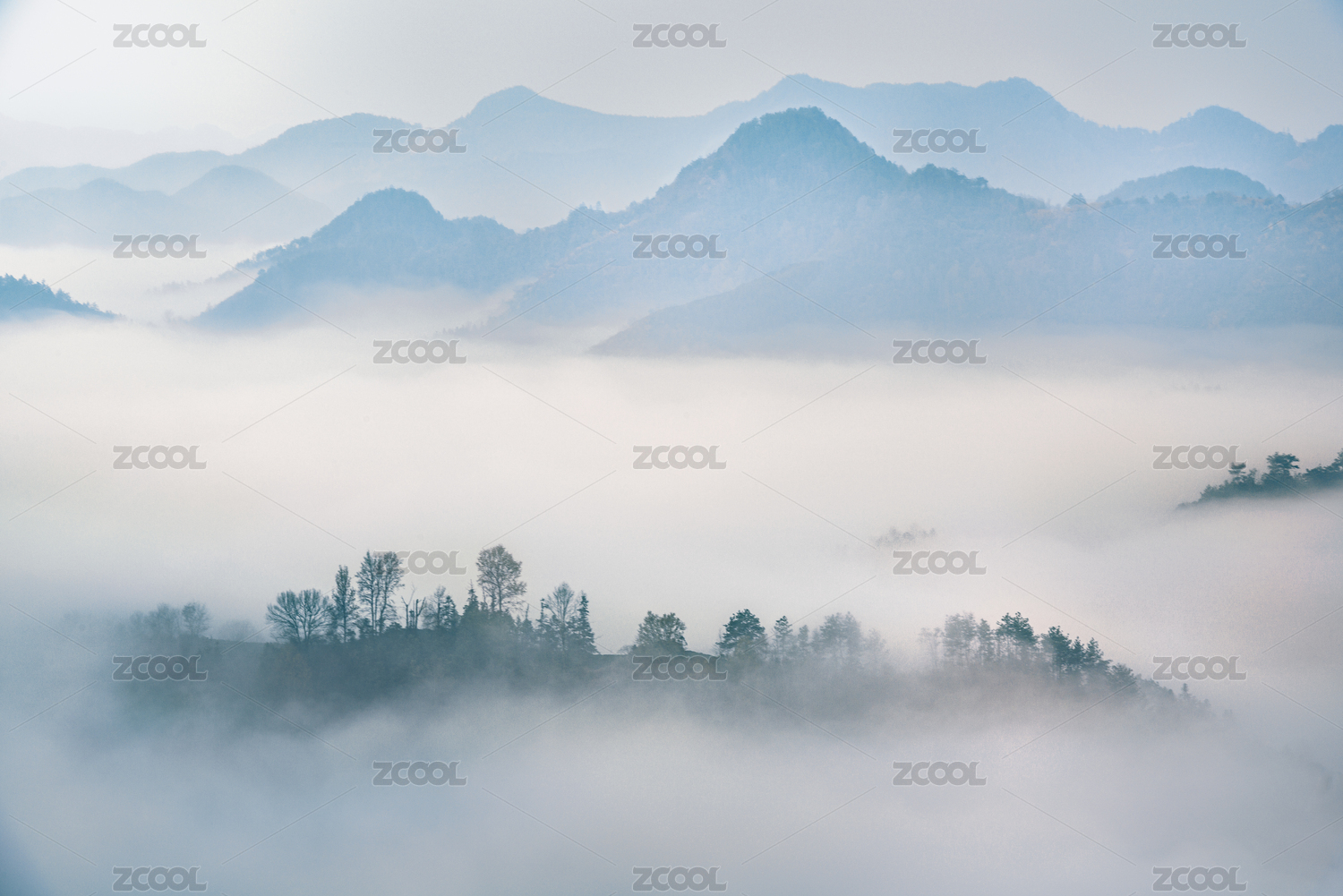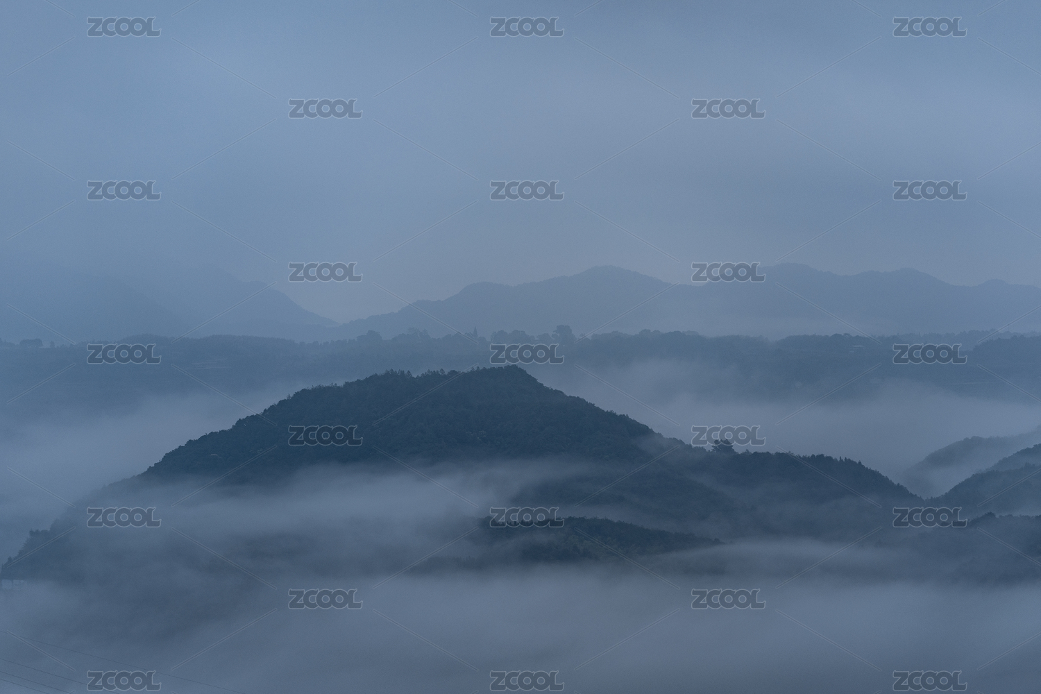黎明时分群山间云雾缭绕,中国江西婺源江岭